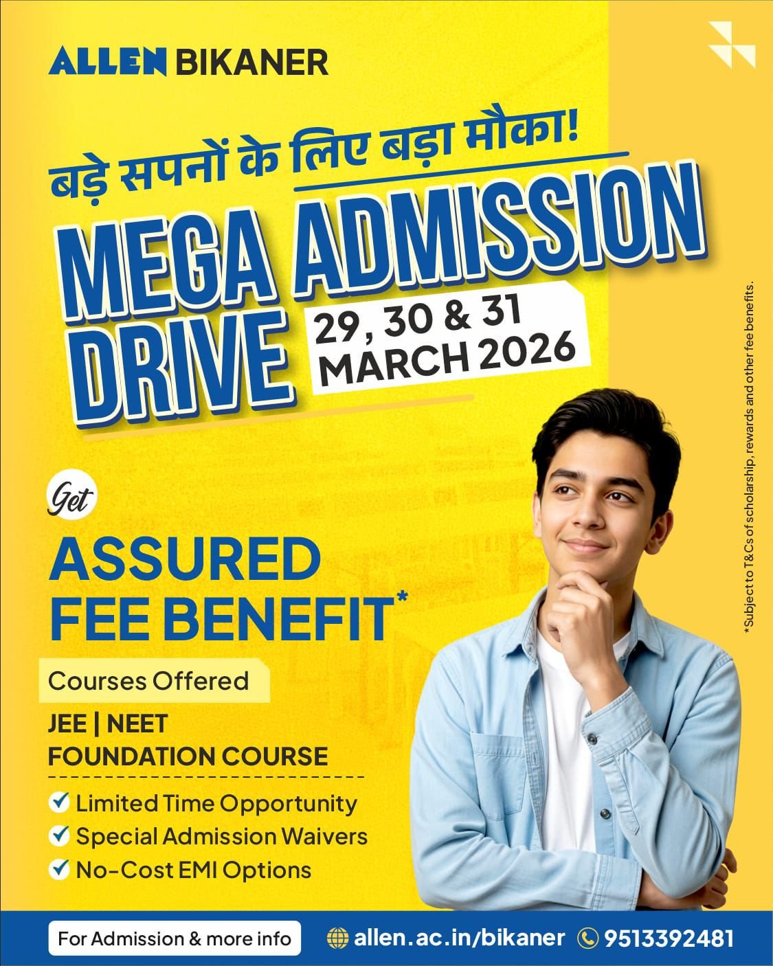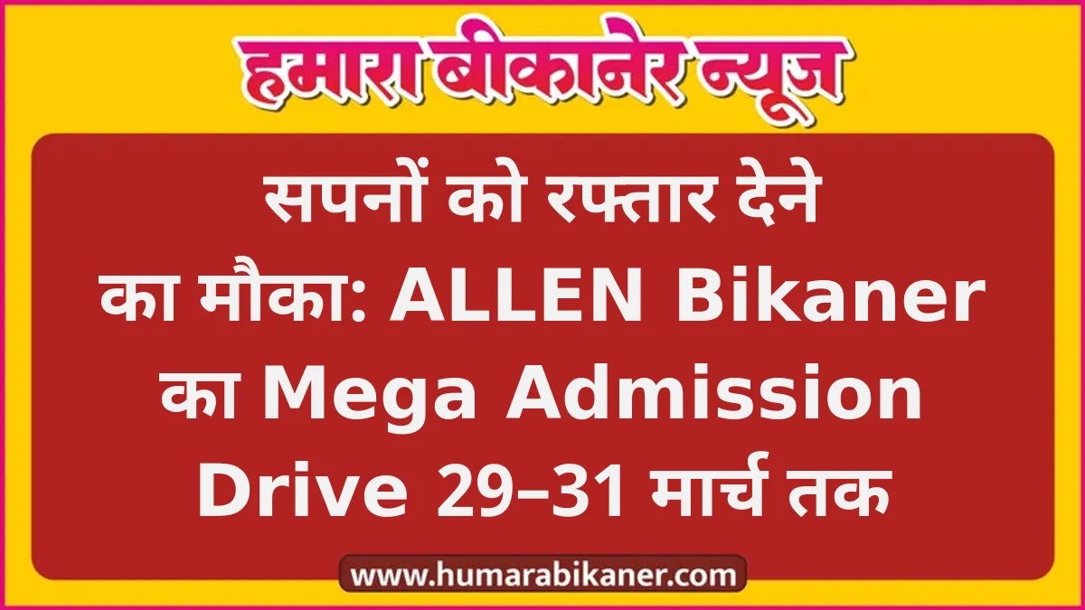 बीकानेर। प्रतियोगी परीक्षाओं की तैयारी करने वाले विद्यार्थियों के लिए ALLEN Bikaner एक बार फिर लेकर आया है बड़ा अवसर। 30 एवं 31 मार्च 2026 को आयोजित होने जा रहे Mega Admission Drive में छात्रों को मिलेगा Assured Fee Benefit, विशेष admission waivers एवं no-cost EMI जैसी सीमित समय की आकर्षक सुविधाएं।