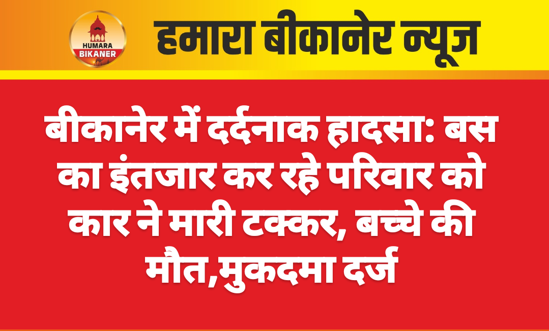 बीकानेर। कोटगेट क्षेत्र में बस का इंतजार कर रहे एक ही परिवार के कई लोगों को टक्कर मारने फरार हो जाने की खबर सामने आयी है। घटना कोटगेट पुलिस थाना क्षेत्र के किसान छात्रावास के पास रानी बाजार में 2 अप्रेल की अलसुबह की है। इस सम्बंध में कोटगेट पुलिस थाने में धोबी तलाई निवासी इजहार आलम ने कार चालक के खिलाफ मुकदमा दर्ज करवाया है।प्रार्थी ने बताया कि वह अपनी पत्नी रहीन, बेटे अबिर, अहद खान, रिश्तेदार नहिाद के साथ खड़ा था और नागौर जाने वाली बस का इंतजार कर रहे थे। इस दौरान तेज गति से आ रही कार ने उनको टक्कर मार दी। जिससे वह सभी गिर गए। प्रार्थी ने बताया कि इलाज के दौरान अबिर खान की मौत हो गयी। वहीं मेरे, पत्नी रहीन व रिश्तेदार नाहिदा के चोटें लगी है। पुलिस ने प्रार्थी की रिपोर्ट के आधार पर मुकदमा दर्ज कर जांच शुरू कर दी है।