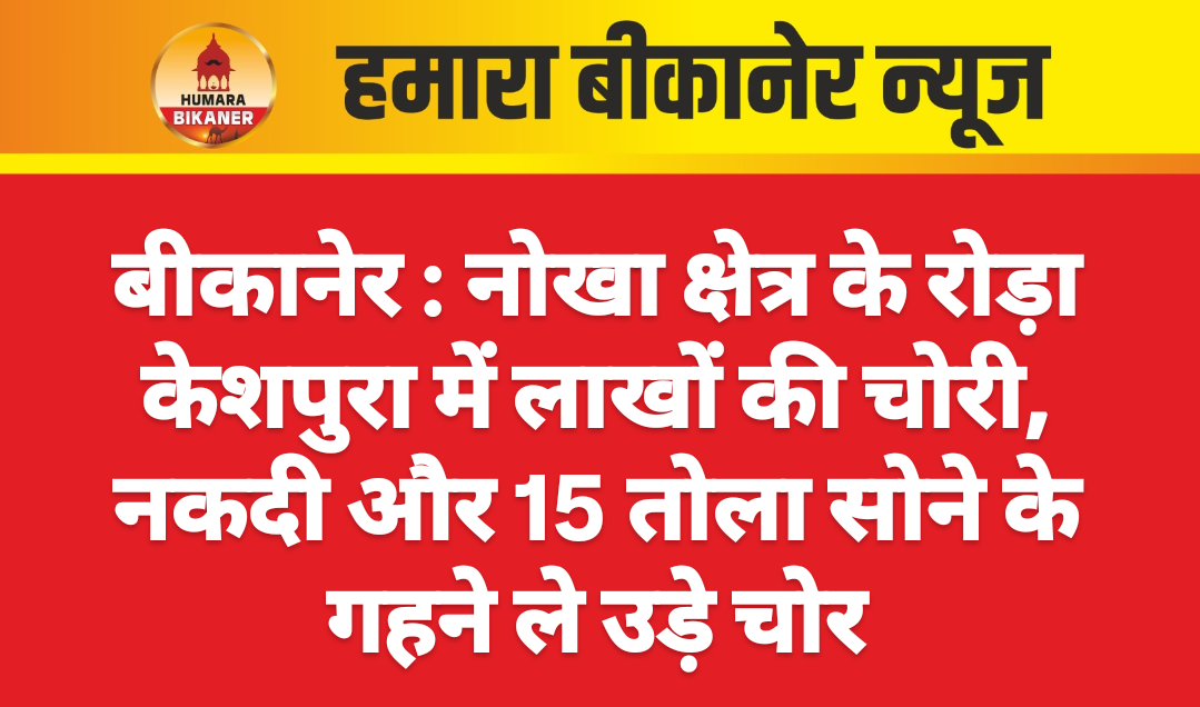 बीकानेर। नोखा थाना क्षेत्र में एक बड़ी चोरी की वारदात सामने आई है, जिसका नोखा थाने में मामला दर्ज हुआ है। रोड़ा केशपुरा ढाणी मुख्य सडक़ पर स्थित हरलाल बिश्नोई के घर में चोरों ने धावा बोला। हरलाल ने पुलिस को दी रिपोर्ट में बताया कि घटना 26 जुलाई की रात की है जब परिवार के सभी सदस्य सो रहे थे। सुबह जागने पर परिवार ने देखा कि घर के दरवाजे खुले हुए थे और कई कमरों के ताले टूटे पड़े थे।