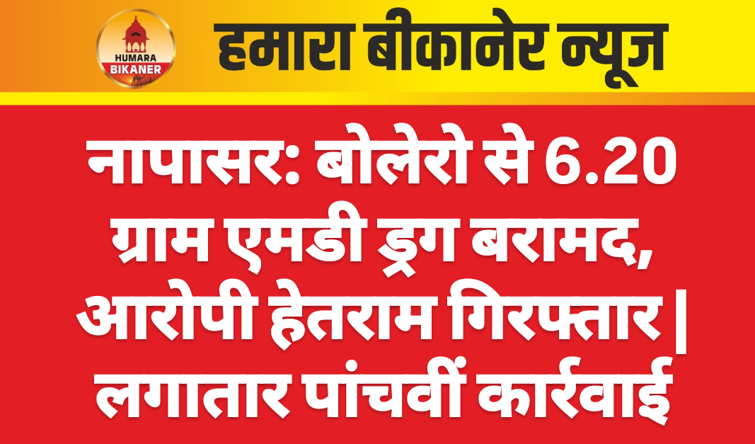 जिले की नापासर पुलिस ने अवैध नशे की तस्करी पर एक ओर कार्रवाई है। नशे के खिलाफ चलाए जा रहे अभियान के तहत नापासर पुलिस ने लगातार पांचवीं कार्रवाई करते हुए बोलेरो गाड़ी से छह ग्राम 20 मिलीग्राम एमडी ड्रग बरामद की है। गाड़ी में सवार आरोपी हेतराम जो कि राजेरा गांव का निवासी है, उसे मौके से गिरफ्तार कर लिया गया है। आईजी हेमंत शर्मा व एसपी कावेन्द्र सिंह सागर के निर्देशन में यह कार्रवाई थानाधिकारी लक्ष्मण सुथार के नेतृत्व में की गई। पुलिस ने बोलेरो गाड़ी का पीछा कर उसे रोका और तलाशी के दौरान नशा बरामद हुआ।