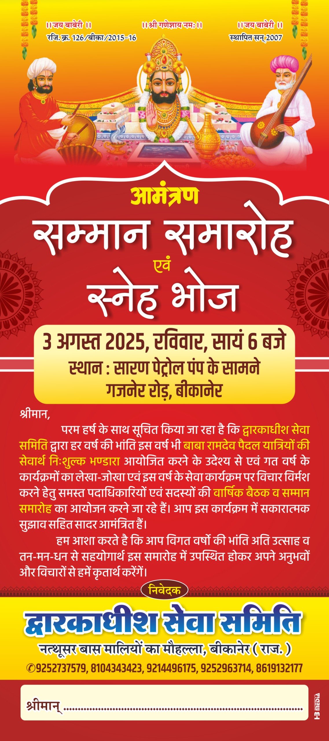 बीकानेर।शहर की अग्रणी सामाजिक संस्था द्वारकाधीश सेवा समिति, नत्थूसर बास मालियों का मोहल्ला द्वारा प्रतिवर्ष की भांति इस वर्ष भी वार्षिक सम्मान समारोह एवं स्नेह भोज का भव्य आयोजन किया जा रहा है। यह कार्यक्रम आज, रविवार 3 अगस्त 2025 को शाम 6 बजे सारण पेट्रोल पंप के सामने, गजनेर रोड, बीकानेर स्थित स्थल पर आयोजित होगा।