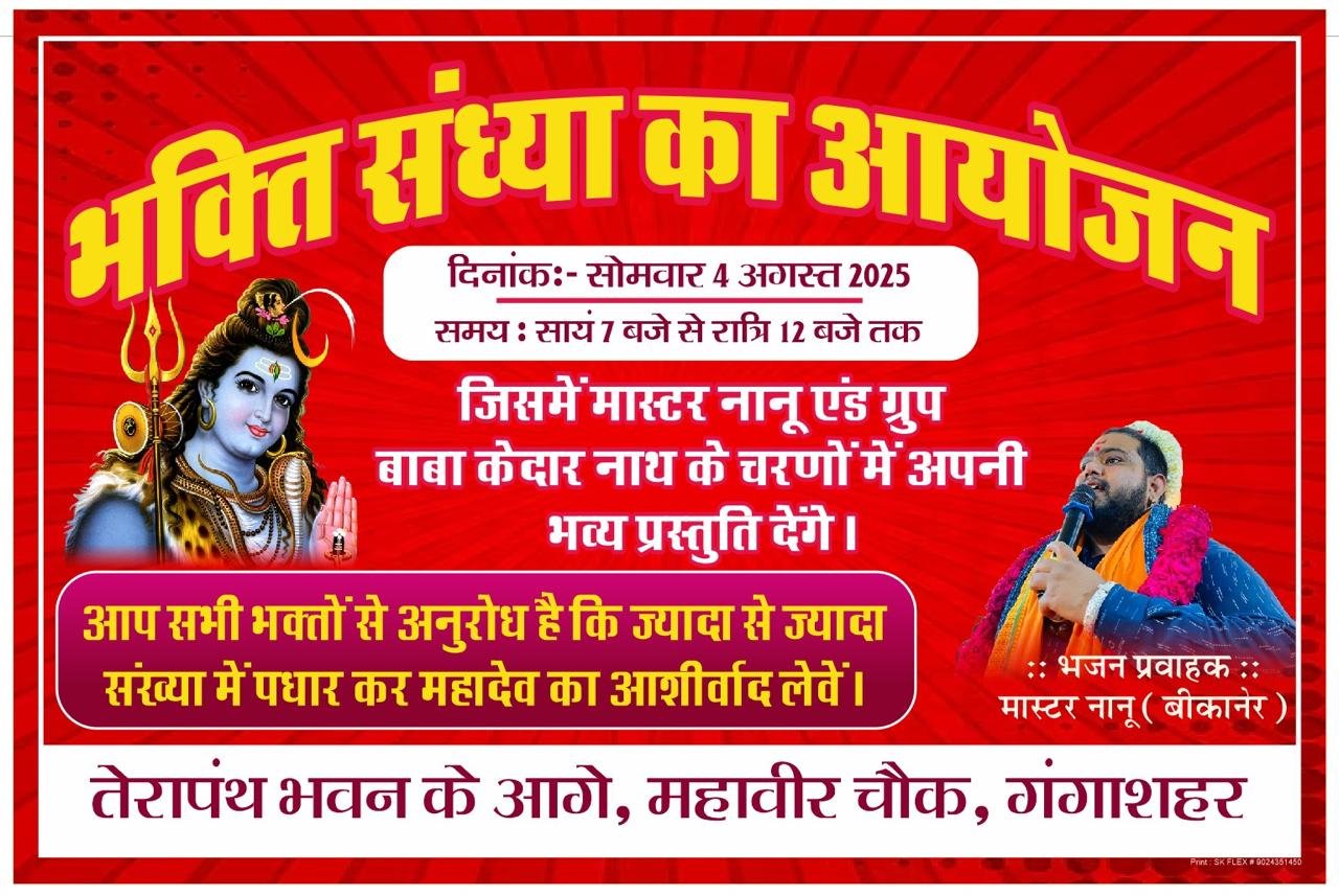 गंगाशहर के महावीर चौक स्थित केदारनाथ महादेव मंदिर में सोमवार, 4 अगस्त को भक्ति संध्या का भव्य आयोजन किया जाएगा। कार्यक्रम का आयोजन तेरापंथ भवन के सामने किया जा रहा है।