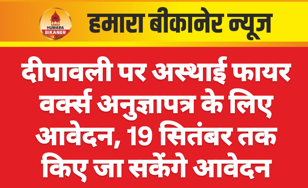 बीकानेर, 10 सितंबर। दीपावली पर अस्थाई फायरवर्क्स (केवल ग्रीन आतिशबाजी) के लिए शहरी क्षेत्र के इच्छुक आवेदक 19 सितम्बर (शुक्रवार) तक निर्धारित आवेदन-पत्र भर कर, आवश्यक दस्तावेज संलग्न कर जिला कलेक्टर कार्यालय में जमा करवा सकते हैं।