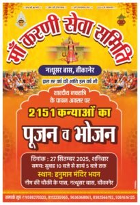 बीकानेर। शारदीय नवरात्रि के शुभ अवसर पर माँ करणी सेवा समिति नत्थूसर बास, बीकानेर हर वर्ष की भांति इस वर्ष भी भव्य आयोजन करने जा रही है। समिति की ओर से हनुमान जी मंदिर भवन परिसर, नत्थूसर बास में 2151 कन्याओं का पूजन व भोजन कार्यक्रम रखा गया जायेगा