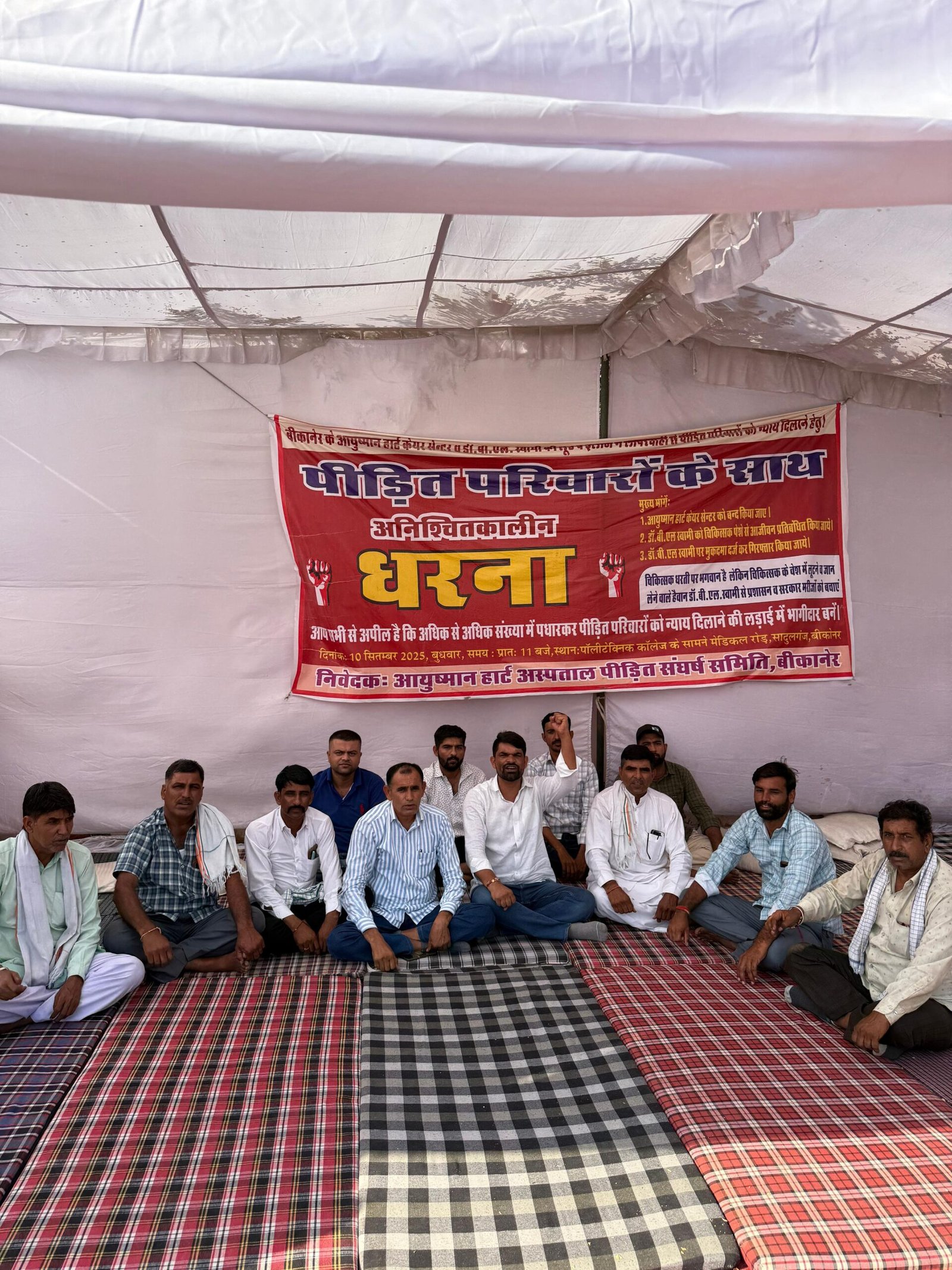 आज दिनांक 28 सितम्बर 2025 रविवार को आयुष्मान हार्ट अस्पताल पीड़ित संघर्ष समिति के बैनर तले व कांग्रेस प्रदेश सचिव रामनिवास कुकणा के नेतृत्व में आयुष्मान हार्ट केयर सेंटर तथा डॉक्टर बीएल स्वामी से पीड़ित परिवारों को न्याय दिलाने के लिए चल रहा अनिश्चितकालीन धरना आज 19 वें दिन जारी रहा।