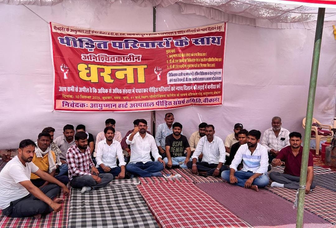 आज दिनांक 29 सितम्बर 2025 सोमवार को आयुष्मान हार्ट अस्पताल पीड़ित संघर्ष समिति के बैनर तले व कांग्रेस प्रदेश सचिव रामनिवास कुकणा के नेतृत्व में आयुष्मान हार्ट केयर सेंटर तथा डॉक्टर बीएल स्वामी से पीड़ित परिवारों को न्याय दिलाने के लिए चल रहा अनिश्चितकालीन धरना आज 20 वें दिन जारी रहा।
