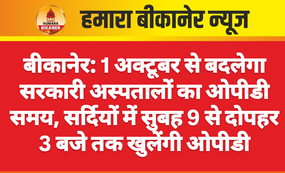 बीकानेर संभाग के सबसे बड़े हॉस्पिटल पीबीएम सहित राजस्थान के दूसरे सरकारी अस्पतालों में एक अक्टूबर से ओपीडी का समय बदल जाएगा। इस बदलाव के बाद ओपीडी का समय सुबह नौ से दोपहर तीन बजे तक होगा। सर्दियों के सीजन को देखते हुए ये बदलाव 31 मार्च तक रहेगा।