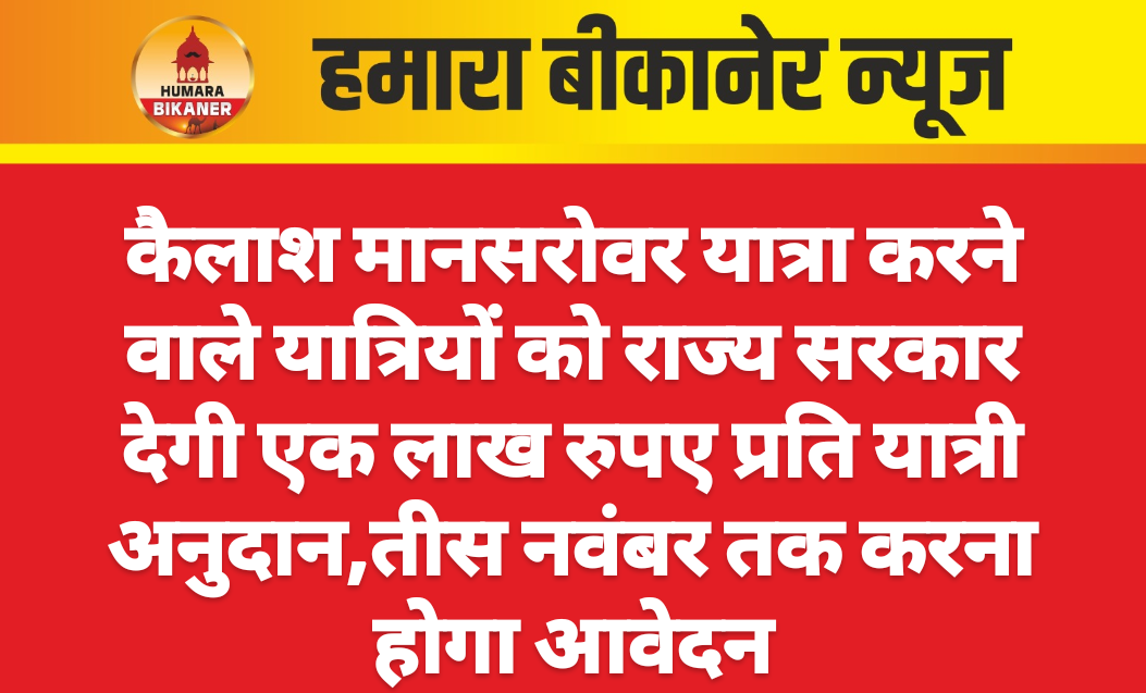 बीकानेर, 6 अक्टूबर। भारत सरकार के विदेश मंत्रालय द्वारा करवाई जाने वाली ‘कैलाश मानसरोवर यात्रा-2025’ के लिए राज्य सरकार के देवस्थान विभाग द्वारा राज्य के 100 तीर्थ यात्रियों को यात्रा पूर्ण करने के पश्चात अधिकतम एक लाख रुपए की राशि प्रदान की जाएगी। देवस्थान विभाग के अतिरिक्त आयुक्त ने गितेश श्री मालवीया ने बताया कि जुलाई से सितंबर के मध्य यह यात्रा संपन्न करने के पश्चात अगले दो माह में 30 नवंबर तक इसके लिए आवेदन किया जा सकेगा।