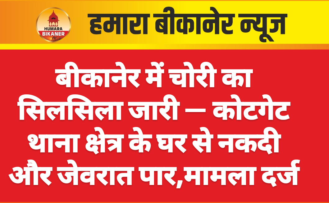 बीकानेर जिले में चोरी का ग्राफ थमने का नाम नहीं ले रहा। आये दिन चोरी की वारदातें हो रही है। चोरी का ताजा घटना शहर के कोटगेट पुलिस थाना क्षेत्र में हुई है। चोरी की यह घटना नौ अक्टूबर को बी सेठिया गली चंदर सागर कुएं के पास स्थित मकान में हुई।इस संबंध में विद्या खत्री पत्नी उमेश खत्री ने अज्ञात चोरों के खिलाफ पुलिस को रिपोर्ट देते हुए मामला दर्ज कराया है। परिवादिया ने बताया कि उसके घर पर नौ अक्टूबर दो बजे से छह बजे के बीच चोरी हुई है। चोर घर से दो सोने के कंगन (जोड़ी), गले की चेन, कानों के टॉप्स (जोड़ी) तथा लगभग अस्सी हजार रुपए नकदी के साथ केईएम रोड स्थित इंडियन बैंक के लॉकर की चाबी चोरी कर ले गए। पुलिस ने परिवादिया की रिपोर्ट पर मामला दर्ज कर जांच शुरू कर दी। मामले की जांच हैड कांस्टेबल प्रवीण को सौंपी गई है।