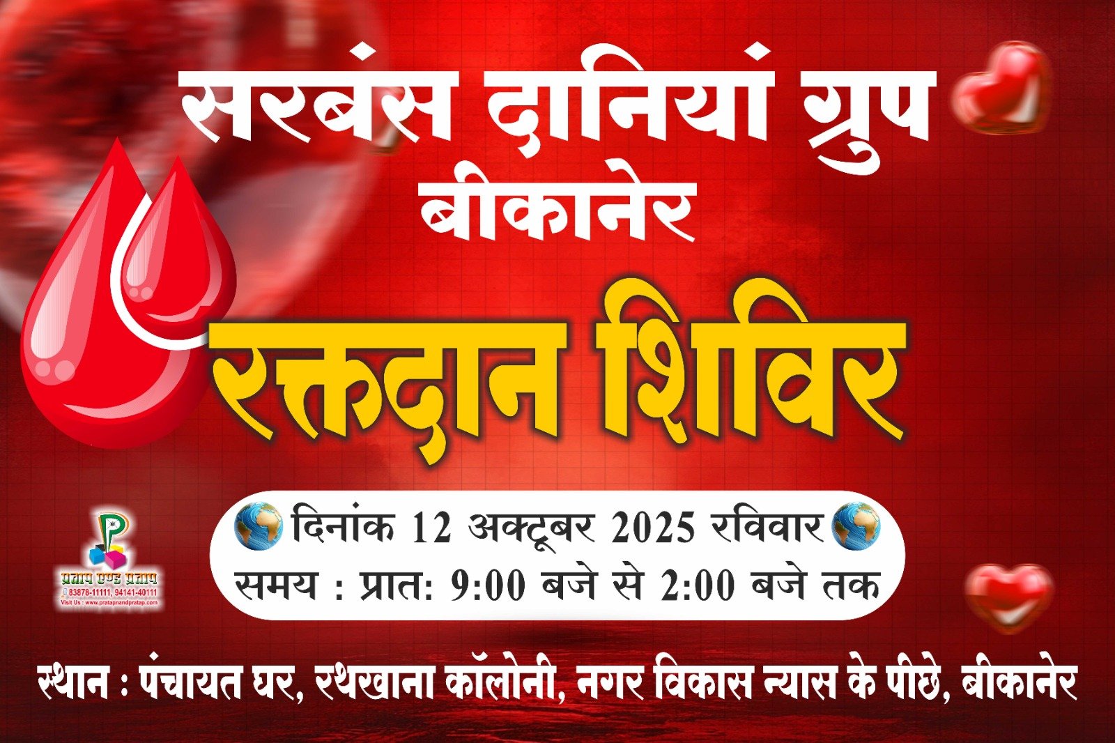 बीकानेर सरबंस दानिया ग्रुप के सौजन्य से प्रतिवर्ष की भांति इस वर्ष भी एक विशाल रक्तदान शिविर का आयोजन किया जा रहा है। यह शिविर पंचायत घर, रथखाना कॉलोनी में प्रातः 9 बजे से दोपहर 2 बजे तक आयोजित होगा।