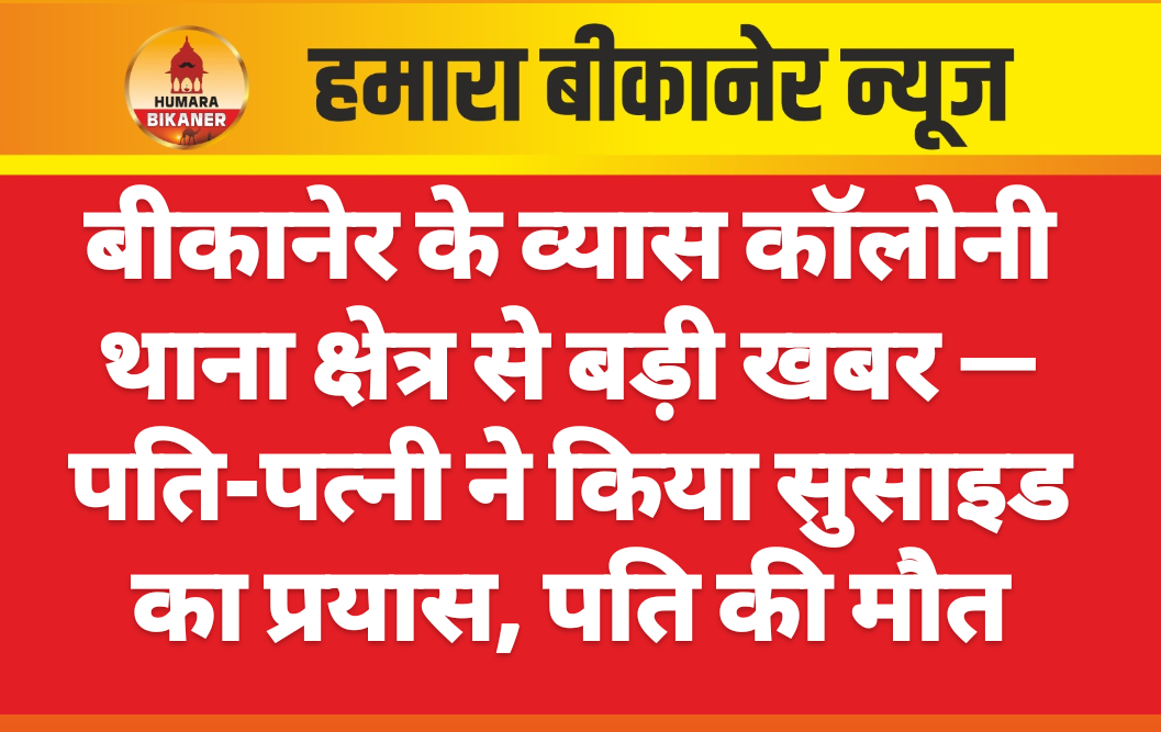 बीकानेर शहर के व्यास कॉलोनी पुलिस थाना क्षेत्र में इस वक्त बड़ी खबर सामने आई है, जहां पति-पत्नी द्वारा सुसाइड करने का प्रयास किया गया और इस प्रयास में पति की मौत हो गई। वहीं पत्नी को पीबीएम अस्पताल में भर्ती करवाया गया है।