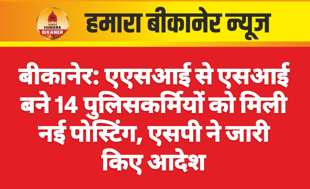 बीकानेर। बीते दिनों पदोन्नत होकर एएसआई से एसआई बने पुलिसकर्मियों को पोस्टिंग दी गयी है। इस सम्बंध में बीकानेर एसपी कावेन्द्र सागर ने आदेश जारी किए है। आदेशों के अनुसार 14 एसआई को पोस्टिंग दी है।जिनमें रतनाराम को मुक्ताप्रसाद, हंसराज को छतरगढ़ चौकी, सोहनलाल को मुक्ताप्रसाद, मनीराम को चौकी बज्जू, तनसुखराम को नोखा, कुशलाराम को नोखा चौकी, राजेन्द्र कुमार को श्रीडूंगरागढ़, मोहनलाल को श्रीडूंगरगढ़, लक्ष्मण सिंह को चौकी पवनपुरी, रतनलाल को सदर, अशोक कुमार को चौकी भीनासर, सुभाष को जेएनवीसी, कोहर सिंह को चौकी नत्थुसर घाटी लगाया गया है।