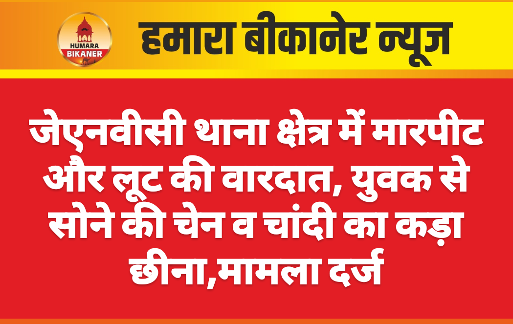 जेएनवीसी थाना क्षेत्र में मारपीट और लूट की वारदात सामने आई है। कुम्हारों का मोहल्ला निवासी अनिल खटोड़ ने पुलिस को दी रिपोर्ट में बताया कि 28 सितंबर को उसका छोटा भाई व्यास कॉलोनी स्थित गुरुद्वारे के सामने मौजूद था। इस दौरान रुद्र, राधे, लवेश और गोविंद ने एक राय होकर उसके भाई पर हमला कर दिया।पीड़ित पक्ष का आरोप है कि मारपीट के दौरान आरोपियों ने उसके भाई के गले से सोने की चेन और हाथ से चांदी का कड़ा छीन लिया। घटना के बाद पीड़ित ने थाने में शिकायत दर्ज करवाई। पुलिस ने मामला दर्ज कर जांच का जिम्मा हेड कांस्टेबल हनुमानराम को सौंपा है।स्थानीय लोगों के अनुसार, घटना के बाद क्षेत्र में दहशत का माहौल बना हुआ है। पुलिस आरोपियों की तलाश में जुटी हुई है।