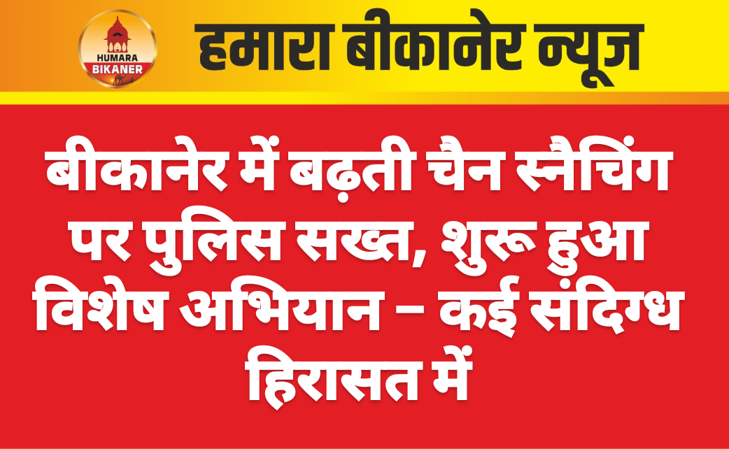 बीकानेर। शहर में लगातार बढ़ रही चैन स्नैचिंग की वारदातों पर अब पुलिस ने सख्त रूख अपना लिया है। हाल ही में महिला जज के साथ हुई घटना को गंभीरता से लेते हुए जिला पुलिस पूर्णत: जीरो टॉलरेंस मोड में आ चुकी है। पुलिस अधीक्षक कावेंद्र सिंह सागर के नेतृत्व में विशेष अभियान शुरू किया गया है। इस अभियान की प्रत्यक्ष निगरानी अतिरिक्त पुलिस अधीक्षक सौरभ तिवाड़ी कर रहे हैं, जिसके तहत सभी थानों में टीमों को सक्रिय किया गया है।