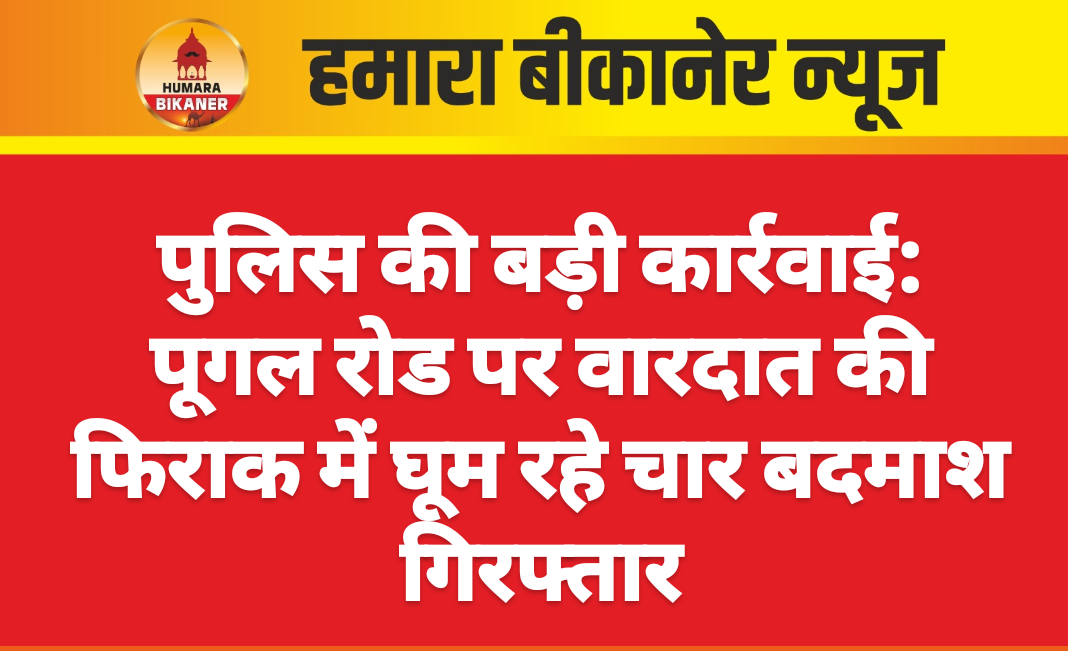 बीकानेर। पुलिस ने अपराधियों के खिलाफ सख्त रुख अपनाते हुए पूगल रोड पर शांति भंग के आरोप में चार बदमाशों को गिरफ्तार किया है। पकड़े गए आरोपियों की पहचान हुसैन, जसवंत जाट, महावीर जाट और लक्की के रूप में हुई है। जानकारी के अनुसार आरोपी किसी बड़ी वारदात को अंजाम देने की फिराक में थे।