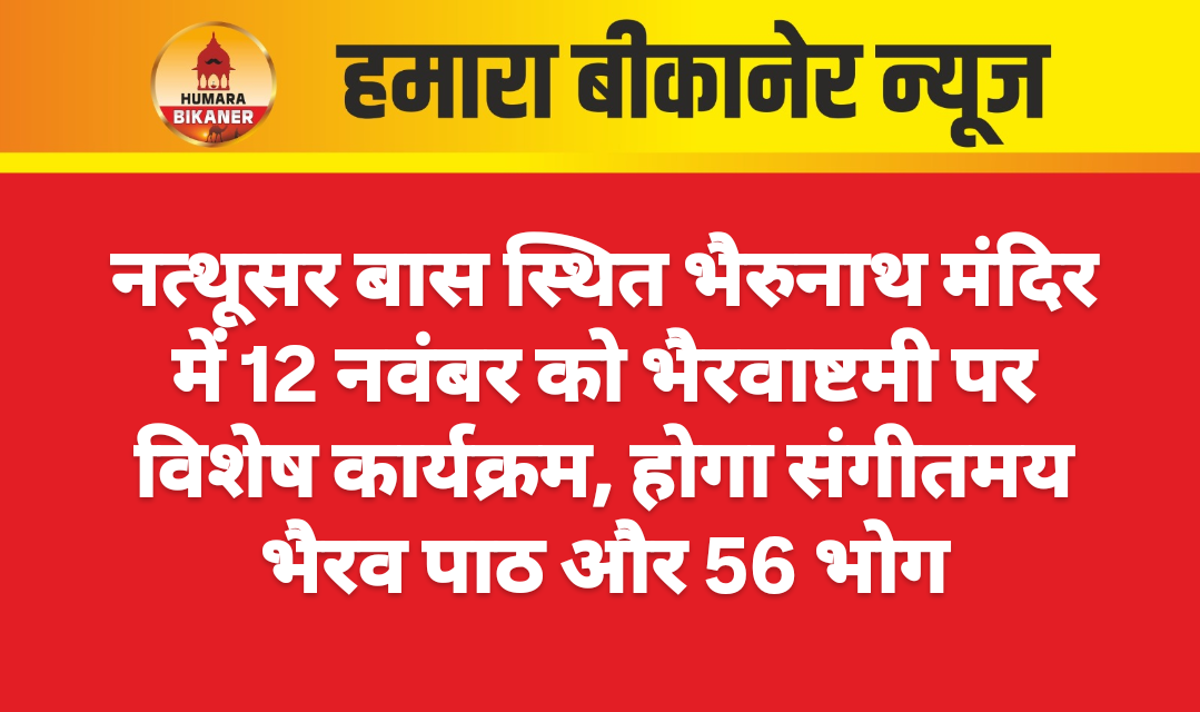 बीकानेर। हर वर्ष की भाँति इस वर्ष भी नत्थूसर बास के होलिका चोक स्थित श्री त्रिलोचन कोडाणा भैरुनाथ मंदिर में 12 नवंबर को भैरवाष्टमी पर विभिन्न कार्यक्रम होंगे। व्यवस्थापक दिनेश सांखला ने बताया की श्री नवलेश्वर मठ के अधिष्ठाता व महंत श्री श्री 108 शिव सत्यनाथ जी महाराज के परम सानिध्य में और पं जुगल किशोर ओझा (पुजारी बाबा) द्वारा गणेश पूजन के पश्चात संगीतमय भैरव पाठ, अभिषेक और महाआरती की जायेगी। इस दिन बाबा भैरुनाथ का विशेष श्रृंगार किया जायेगा और 56 भोग का भोग लगाया जायेगा।