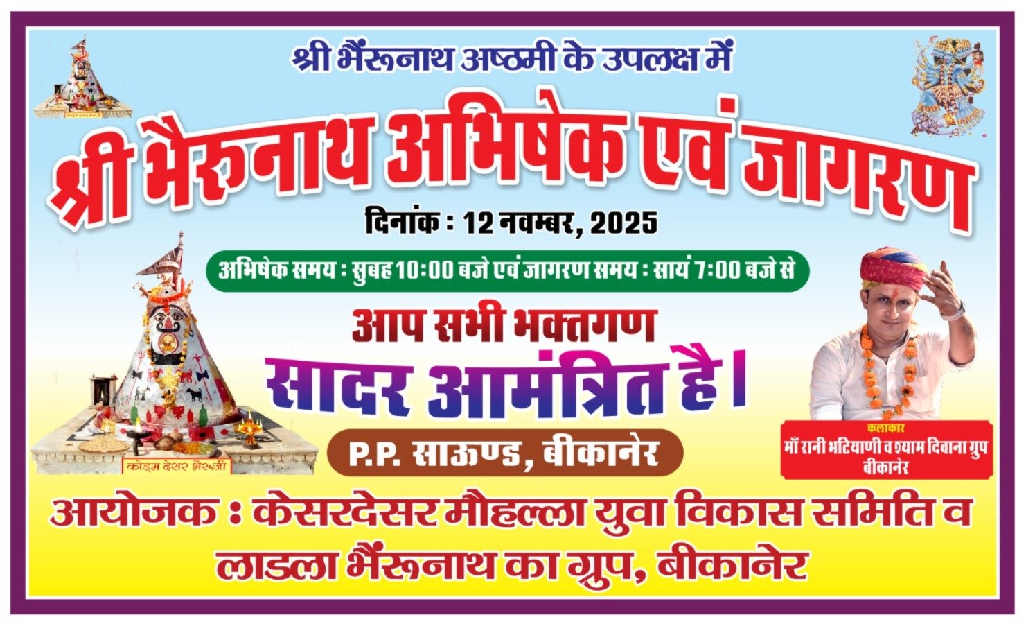 हर वर्ष की भाँति इस वर्ष भी “केसर देसर युवा मोहल्ला विकास समिति” एवं “लाडला भैरूनाथ का ग्रुप” द्वारा केसर देसर चौक में 12 नवंबर को भैरवाष्टमी पर गणेश पूजन एवं विभिन्न कार्यक्रम रखे गए है।