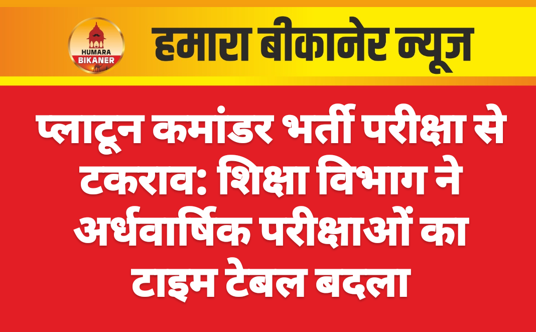 बीकानेर। प्लाटून कमांडर सीधी भर्ती परीक्षा – 2025 और 20 नवम्बर से शुरू होने वाली अद्र्धवार्षिक परीक्षा की तिथियों में टकराव के चलते शिक्षा निदेशालय ने अद्र्धवार्षिक परीक्षा के टाइम टेबल में आंशिक संशोधन किया है। दरअसल, राजस्थान कर्मचारी चयन बोर्ड जयपुर की ओर से 22 नवंबर को प्लाटून कमांडर सीधी भर्ती परीक्षा का आयोजन विभिन्न जिलों में किया जाएगा।