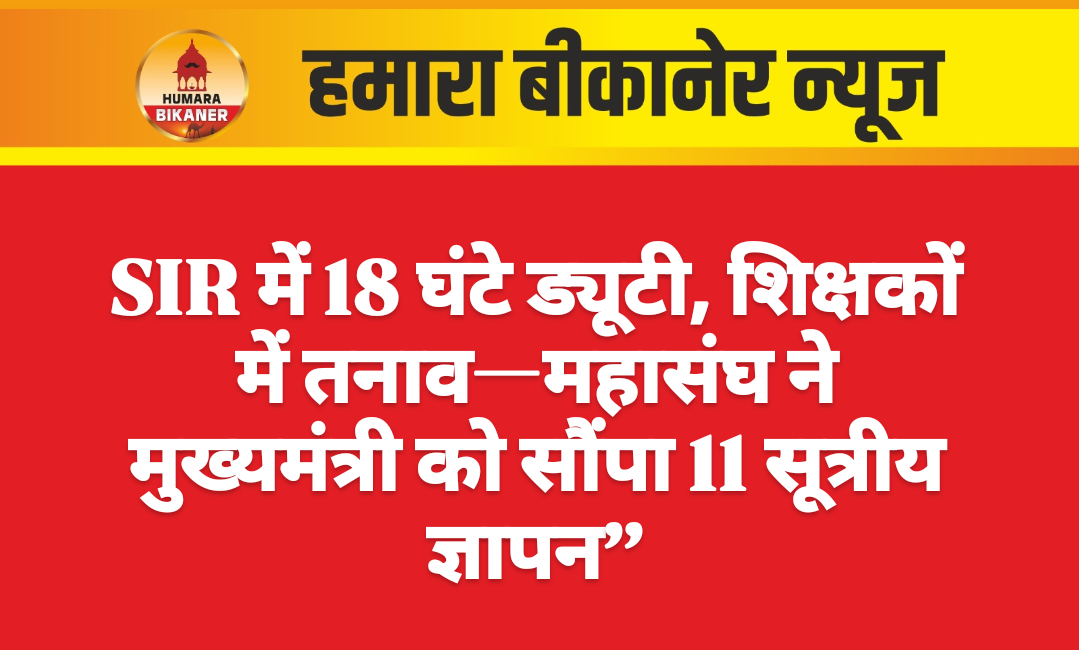 अखिल राजस्थान राज्य कर्मचारी संयुक्त महासंघ (एकीकृत) के प्रदेश अध्यक्ष केसर सिंह चांपावत एवं प्रदेश महामंत्री जगेश्वर प्रसाद शर्मा ने मुख्यमंत्री को ज्ञापन सौंपकर प्रदेशभर में संचालित विशेष सघन मतदाता सूची पुनरीक्षण कार्यक्रम (SIR) में अधिकारियों द्वारा सुपरवाइजर/बीएलओ कार्य में लगे शिक्षकों एवं कार्मिकों के साथ किए जा रहे अमानवीय व्यवहार पर गहरा रोष व्यक्त किया है।