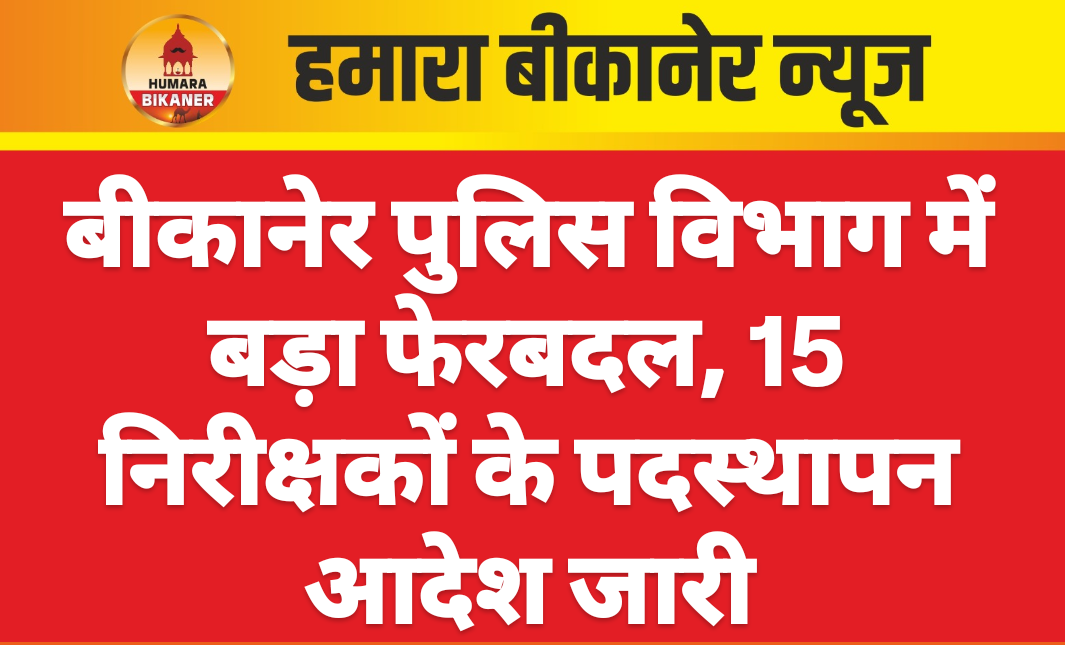 बीकानेर पुलिस महकमें से बड़ी खबर सामने आयी है। इस सम्बंध में एसपी कावेन्द्र सागर ने आदेश जारी किए है। आदेशों के अनुसार पुलिस लाईन से 15 पुलिस निरीक्षकों को थानों में नियुक्त किया गया है। जिसमें भजनलाल को महाजन, जगदीश प्रसाद को बज्जू, संध्या को शेरूणा, कविता पूनियां को नयाशहर, सविता डाल को कोतवाली, ईमीचंद को हदां, राणीदान को संचित निरीक्षक, कानाराम को चल यातायात, सतीश यादव को एससी एसटी सेल, रघुवीर सिंह को महिला अपराध व अनुसंधान सेल, सुमेररसिंह को त्वरित अनुसंधान निस्तारण दल, देवेन्द्र सोनी को अभय कमांड, रेणुबाला को प्रभारी महिला पेट्रोलिंग, पुष्पेन्द्र को पुलिस परामर्श व सहायता केन्द्र, लक्ष्मण सिंह को सचित निरीक्षक लगाया गया है।