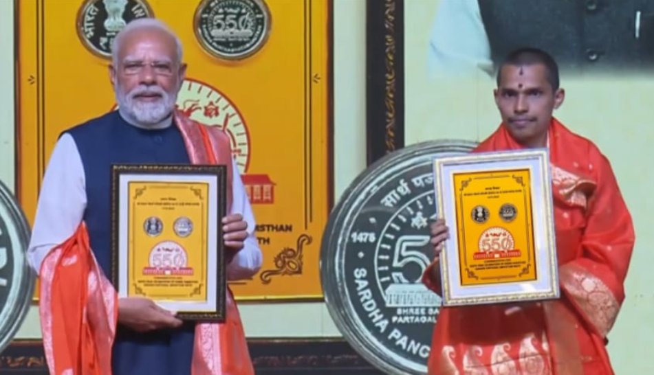 देश के प्रधानमंत्री शुक्रवार को गोवा के दौरे पर रहे। इस दौरान पीएम नरेन्द्र मोदी ने सार्ध पंचशतमानोत्सव कार्यक्रम में भाग लिया । इस समारोह में प्रधानमंत्री मोदी ने श्री संस्थान गोकर्ण पर्तगाळी जीवोत्तम मठ के स्थापना के 550 वर्ष पूर्ण होने के उपलक्ष्य में 550 रुपये मूल्यवर्ग का स्मारक सिक्का जारी किया ।द्वैत परम्परा का पालन करने वाले संस्थान गोकर्ण पर्तगाळी जीवोत्तम मठ को गौड़ सारस्वत ब्राह्मण समुदाय का प्रथम वैष्णव मठ माना जाता है। सिक्कों के जानकार और प्रसिद्ध मुद्राशास्त्री बीकानेर के सुधीर लुणावत के अनुसार यह स्मारक सिक्का भारत सरकार की हैदराबाद टकसाल द्वारा ढाला गया है। सिक्के का कुल वजन 35 ग्राम है, जिसमें 50 प्रतिशत चांदी, 40 प्रतिशत तांबा, तथा 5-5 प्रतिशत जस्ता और निकल का मिश्रण है।सिक्के के एक तरफ श्री संस्थान गोकर्ण पर्तगाळी जीवोत्तम मठ के 550वें वर्ष के उत्सव का प्रतीक चिन्ह अंकित है जिसके नीचे की ओर अंग्रेज़ी में श्री संस्थान गोकर्ण पर्तगाळी जीवोत्तम मठ लिखा होगा। मठ के 550वें वर्ष के प्रतीक चिन्ह में उदयमान सूर्य का अर्धवृत्ताकार चित्र है सूरज के भीतर की परिधि में 24 नमस् व धर्म दंड सहित पर्तगाळी मठ का चित्र है इस लोगो के ऊपर उड़ते हुए हनुमान जी का चित्र भी जिसके बाईं ओर चक्र तथा दाईं ओर शंख अंकित है।सिक्के की ऊपरी परिधि पर हिंदी में तथा निचली परिधि पर अंग्रेजी में “सार्ध पञ्चशतमनोत्सवः” लिखा हुआ है। सिक्के के दूसरी तरफ अशोक स्तंभ (लायन कैपिटल) अंकित है । इसके नीचे रुपये के प्रतीक चिह्न के साथ मूल्यवर्ग 550 लिखा है । अशोक स्तंभ के दाएं और बाएं हिंदी तथा अंग्रेजी में भारत लिखा है। सुधीर के अनुसार यह सिक्का कभी प्रचलन में नहीं आएगा।