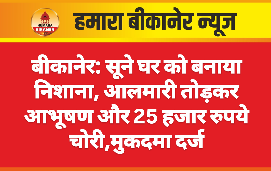 बीकानेर। शहर के मुक्ताप्रसाद थाना क्षेत्र में चोरी की एक बड़ी वारदात सामने आई है। यहां अज्ञात चोरों ने एक सूने पड़े मकान को निशाना बनाकर सोने-चांदी के आभूषण और नकदी चोरी कर ली।जानकारी के अनुसार, परिवादी बद्रीराम पुत्र फूलाराम भाट, निवासी शिव शक्ति गोदाम के पीछे बंगलानगर, ने पुलिस को दी रिपोर्ट में बताया कि वह परिवार सहित किसी काम से घर से बाहर गया हुआ था। इसी दौरान अज्ञात चोर घर में घुसे और आलमारी तोड़कर सोने-चांदी के आभूषणों के साथ करीब 25,000 रुपये नकद चुरा ले गए। घर लौटने पर चोरी का पता चलने के बाद पीड़ित ने पुलिस को सूचना दी। मौके पर पहुंची। पुलिस ने बद्रीराम की रिपोर्ट के आधार पर मुकदमा दर्ज कर जांच शुरू कर दी है।