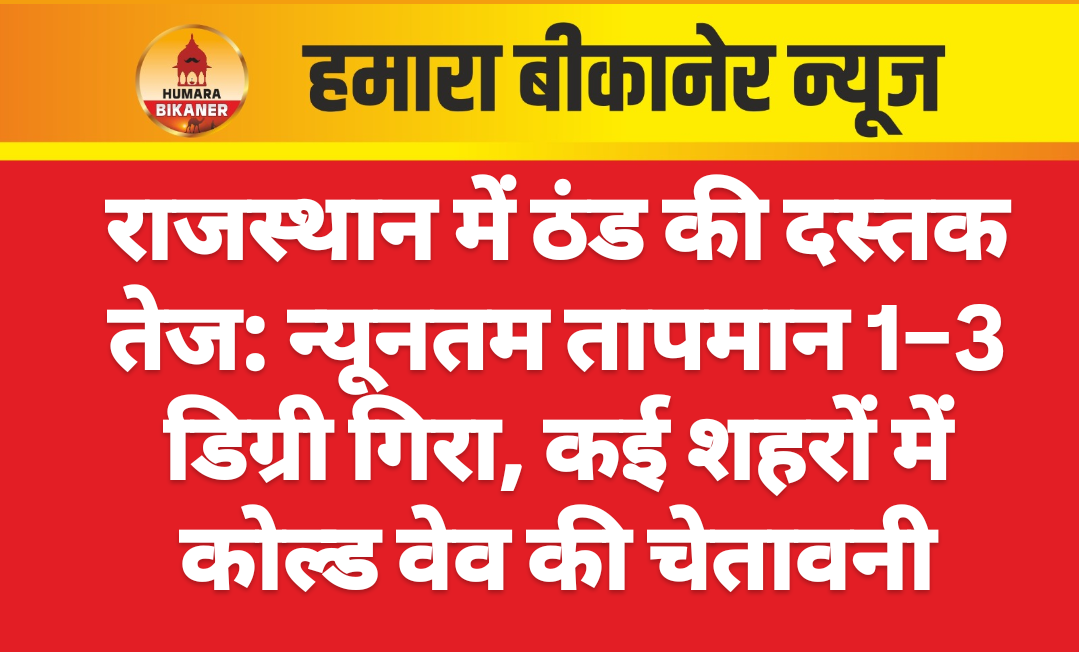 बीकानेर। दिसंबर के शुरू होने के साथ ही प्रदेश में अब सर्दी को लेकर अलर्ट जारी कर दिया गया है। दिसंबर के पहले सप्ताह में कोल्ड वेव का अनुमान लगाया जा रहा है । रविवार को प्रदेश के कई शहरों में रात का न्यूनतम तापमान 1 से 3 डिग्री तक गिर गया। सीकर, अलवर, चूरू, श्रीगंगानगर समेत कुछ शहरों में कल (30 नवंबर) न्यूनतम तापमान 10 डिग्री सेल्सियस से नीचे यानी सिंगल डिजिट में पहुंच गया।सबसे कम तापमान रविवार को बीकानेर के पास लूणकरणसर में दर्ज हुआ। मौसम विशेषज्ञों के मुताबिक, सोमवार और मंगलवार को राज्य में इसी तरह का मौसम रहने का अनुमान है। 3 दिसंबर से राज्य के कुछ शहरों में शीतलहर का दौर शुरू होगा, जिसके चलते शेखावाटी के जिलों में येलो अलर्ट जारी किया गया है।
