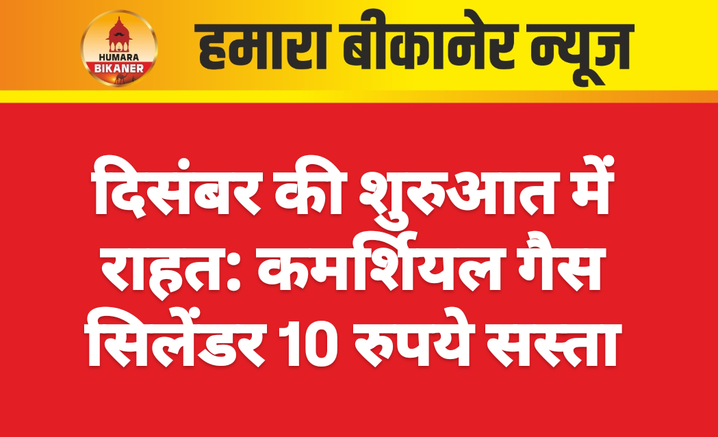 बीकानेर। दिसंबर के पहले ही दिन गैस सिलेंडर के दामों में कटौती की गयी है। हर महीने की पहली तारीख को सिलेंडर के दाम तय किए जाते है। इसी कड़ी में दिसंबर के पहले ही दिन कर्मिशयल गैस सिलेंडर के दामों में कटौती की गयी है। कर्मिशयल गैस सिलेंडर के दाम में दस रूपए की कटौती की गयी है। जिससे होटल, रेस्टोरेंट सहित कर्मिशयल उपभोक्ताओं को लाभ मिल सकेगा।