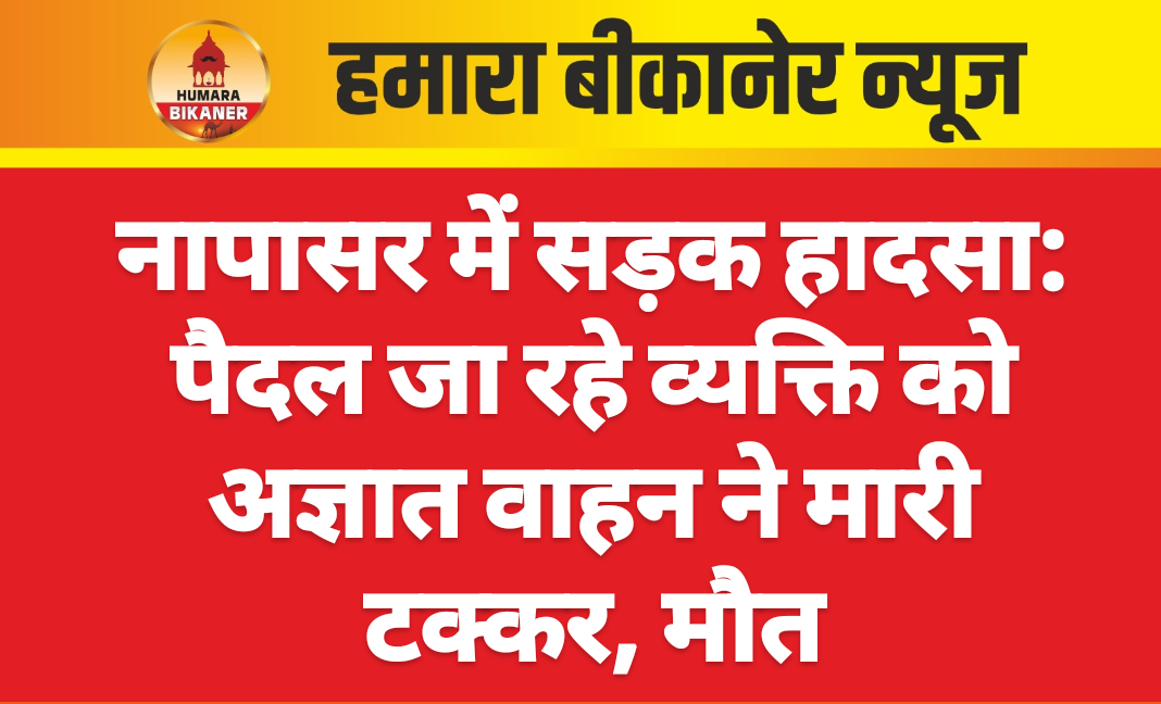 बीकानेर।पैदल चल रहे व्यक्ति को टक्कर मारने से मौत हो जाने की खबर सामने आयी है। घटना नापासर पुलिस थाना क्षेत्र से जुड़ी है। इस सम्बंध में बान्द्रा बास निवासी रविन्द्र वाल्मीकि ने वाहन चालक के खिलाफ मुकदमा दर्ज करवाया है। परिवादी ने बताया कि 30 नवंबर की रात को 10 बजे के आसपास उसके पिता शांतिलाल सूर्या होटल के पास पैदल-पेदल चल रहे थे। इसी दौरान पीछे से आ रहे अज्ञात वाहन ने टक्कर मार दी। जिससे उसके पिता गिर गए और मौत हो गयी। पुलिस ने प्रार्थी की रिपोर्ट के आधार पर मुकदमा दर्ज कर जांच शुरू कर दी है।