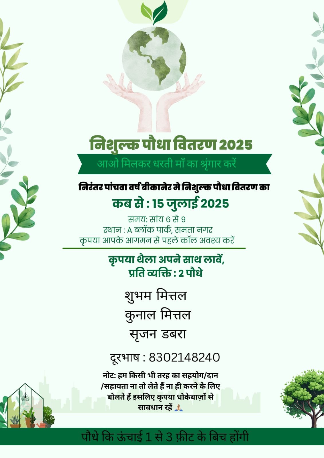 बीकानेर के समता नगर में एक अनूठी पहल देखने को मिली जहां पर प्रकृति को बचाने के लिए 3 दोस्तों (शुभम, कुनाल, सृजन ) ने बगैर किसी के सहयोग से निशुल्क पौधों का वितरण कर रहे है । इन पौधों में छायादार, फलदार, फूल वाले जैसे मीठा नीम, हारसिंगर, कृष्ण श्यामल, बकाइन, करंज, खेजड़ी नीम, शीशम, अमरूद , जामुन, नींबू , शहसूत, अनार , अंजीर सीताफल, साहजन और कनेर आदि शामिल है। पर्यावरण प्रेमी कुनाल मित्तल ने बताया कि गत वर्षों में एक लाख अठतर हजार से ऊपर पौधों का वितरण कर चुके हैं। उन्होंने बताया कि जिनको भी निशुल्क पौधे लेने हो वह अनाज मंडी गेट के सामने समता नगर में पहुंच कर मोबाइल नंबर 8302148240 पर कॉल कर शाम को 6:00 PM से 9:PM तक हर रोज आप पौधे प्राप्त कर सकते हैं। उन्होंने कहा कि सेवा ही सबसे बड़ा धर्म है, हम सबको धरती मां को हरा भरा रखने के लिए इस मुहिम का हिस्सा बनना चाहिए। ताकि आने वाली पीढ़ी आनंद से इस वातावरण में चैन की सांस ले सके। हमने ये छोटी सी पहल कोरोना महामारी को देखते हुई करि थी क्योंकि उस समय ऑक्सीजन की मारामारी चल रही थी जिस कारण हालात बहुत ही खतरनाक हो चुके थे। उन दिनों से हमने ठाना की पर्यावरण के लिए कुछ करते हैं आने वाली पीढ़ी को बचाते हैं। हमारे द्वारा एक छोटी सी की गई शुरुआत से हम ने गत 4 वर्षो में एक लाख अठतर हजार से अधिक पौधों का वितरण कर चुके है, मित्तल ने कहा कि इस सेवा का हिस्सा बन कर हर किसी को कम से कम दो पेड़ पौधे अपने आसपास लगाने चाहिए और उसकी सेवा जब तक करनी चाहिए तब तक वह पौधा बड़ा ना हो जाए। बीकानेर वासियों से आग्रह किया है कि इस मुहिम का हिस्सा बने और धरती को हरा भरा करें। कुनाल ने कहाँ कि इसमें सारा खर्चा हम अपनी जेब से करते है किसी प्रकार का कोई डोनेशन स्वीकार नहीं है, अगर कोई आपसे इस नाम से डोनेशन मांगता है तो कृपया ना देवें 🙏🏻