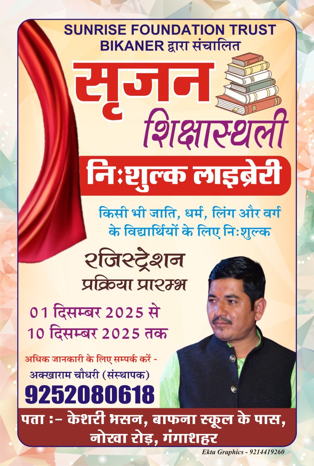 SUNRISE FOUNDATION TRUST, BIKANER द्वारा निर्मित बीकानेर की निःशुल्क सार्वजनिक लाइब्रेरी में प्रवेश प्रक्रिया आज दिनांक 2 दिसंबर से शुरू कर दी गई है जो प्रथम चरण में 10 दिसम्बर तक चलेगी। पूरी प्रवेश प्रक्रिया ऑफलाइन मोड में चलेगी, जो संस्थान पर ही होगी। प्रथम चरण में कुल 200 विद्यार्थियों को प्रवेश दिया जाएगा, अन्य 100 विद्यार्थियों का प्रवेश द्वितीय चरण में किया जाएगा।