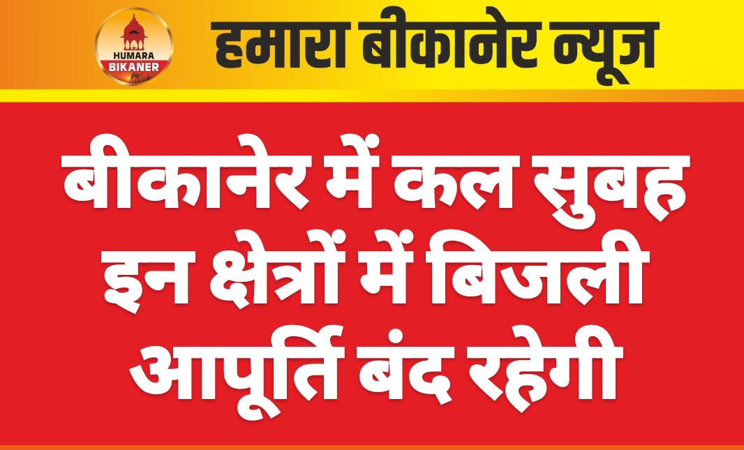 बीकानेर। जीएसएस/फीडर रख-रखाव के लिए जो अत्यावश्यक है, के दौरान गुरुवार 04 दिसम्बर को प्रात: 08:00 बजे से दोपहर 01:00 बजे तक निम्न स्थानों पर विद्युत आपूर्ति बाधित रहेगी।नरसिंह सागर तालाब रोड सर्वोदय बस्ती, भटयानी जी मंदिर के पास, डॉ. प्रीति कल्ला वाली गली, पंडित धर्म कांटा के सामने सर्वोदय बस्ती, भगत सिंह कॉलोनी, एमपी कॉलोनी रोड आदि का क्षेत्र। प्रात: 10:00 बजे से दोपहर 01:00 बजे तक मधुर पब्लिक स्कूल के पीछे नत्थुसर बास का क्षेत्र।