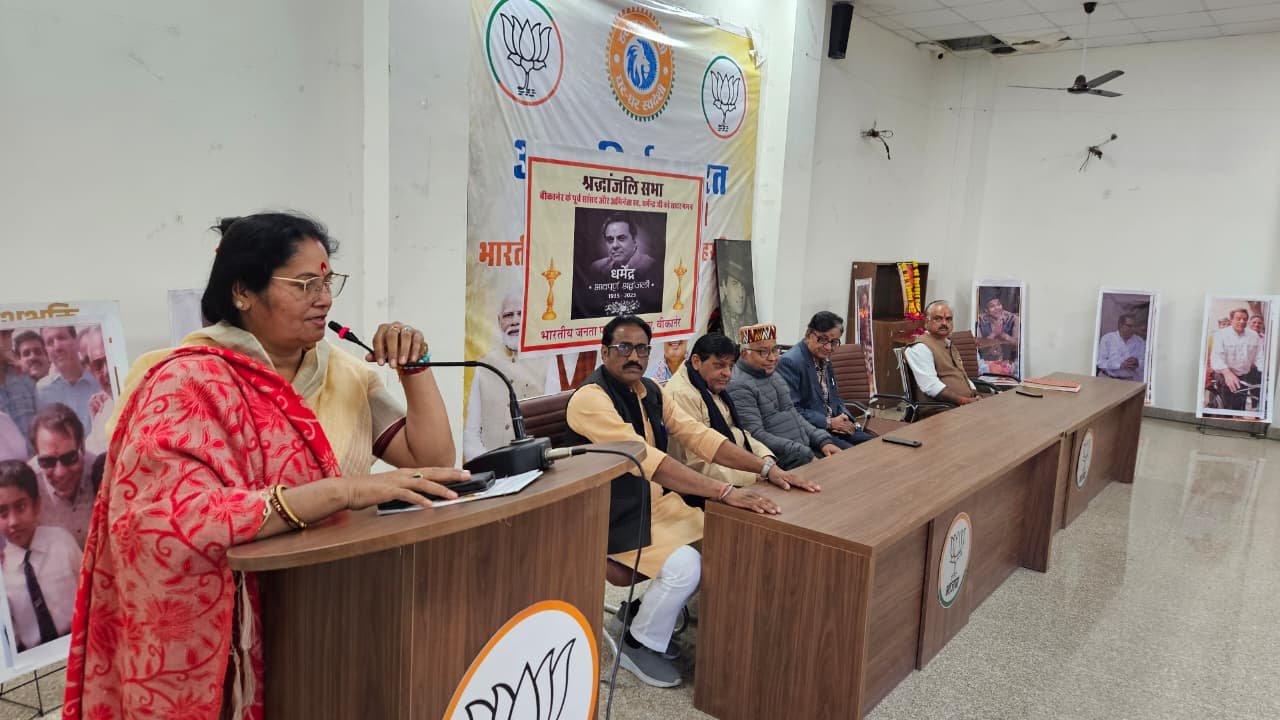श्रद्धांजलि सभा में उपस्थित भाजपा पदाधिकारियों व कार्यकर्ताओं ने स्वर्गीय धर्मेंद्र देओल के चित्र पर पुष्पांजलि अर्पित कर दो मिनट का मौन रखकर उन्हें नमन किया।