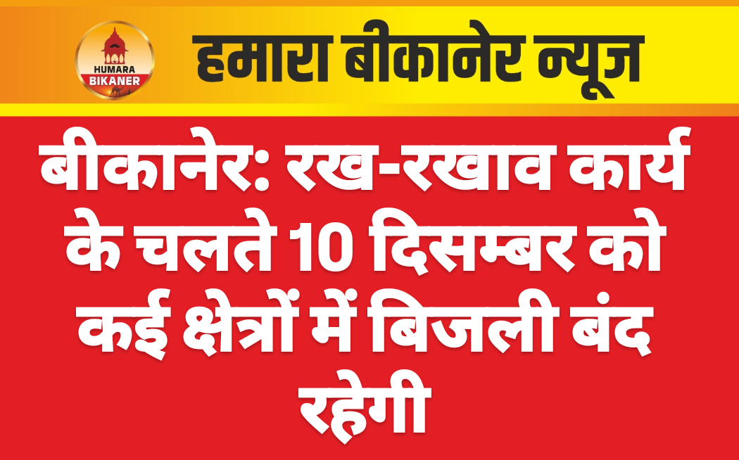 बीकानेर। जीएसएस/फीडर रख-रखाव के लिए जो अत्यावश्यक है, के दौरान बुधवार 10 दिसम्बर को प्रात: 09:30 बजे से दोपहर 12:30 बजे तक निम्न स्थानों पर विद्युत आपूर्ति बाधित रहेगी। सरकारी प्रेस रोड, पुराना फोर्ट स्कूल, गंगा गार्डन, बाबा रामदेव मंदिर, हनुमान हत्था, करणी माता मंदिर, अग्रवाल फर्नीचर, पुरानी गिनानी का क्षेत्र। प्रात: 08:00 बजे से दोपहर 01:00 बजे तक नाकोडा महाराज पार्क के पास, राधा पार्क एमडीवी के पास, सामुदायिक भवन एमडीवी के पास, मेघवालों का शमशान के पास, ट्रैफिक पार्क एमडीवी कॉलोनी, पूर्णानंद जी आश्रम के पास एमडीवी कॉलोनी, दरिया महाराज कोठी एमडीवी कॉलोनी के पास का क्षेत्र।