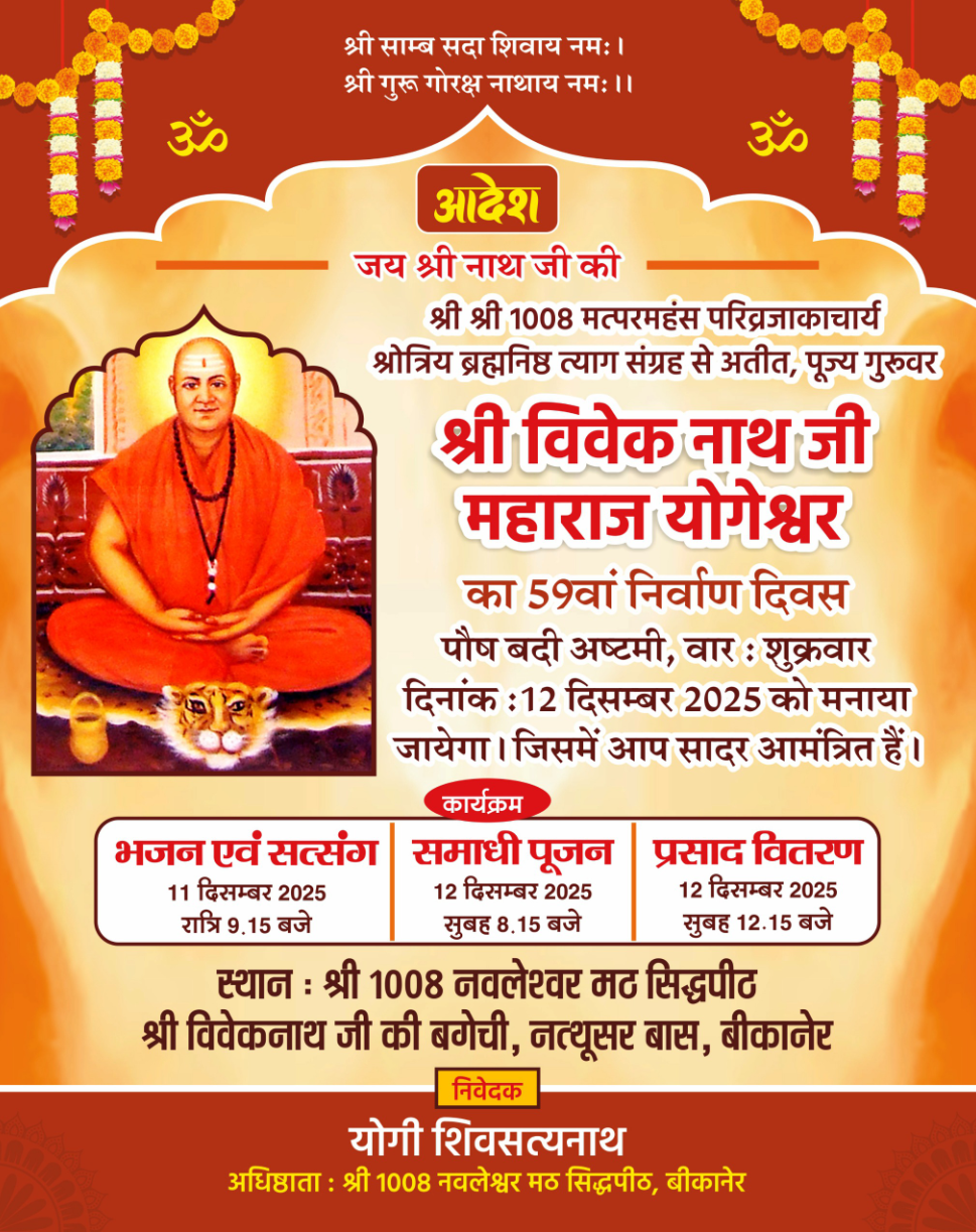 श्री 1008 नवलेश्वर मठ सिद्धपीठ,श्री विवेकनाथजी की बगेची,नत्थूसर बास में मठ के अधिष्ठाता परम पूज्य योगी शिवसत्यनाथ जी महाराज के पावन सान्निध्य में परम पूज्य श्री श्री 1008 महायोगी विवेक नाथ जी महाराज योगेश्वर के 59वें निर्वाण दिवस (58वीं बरसी) का पावन आयोजन 12 दिसंबर 2025, शुक्रवार को अत्यंत श्रद्धा,भक्ति एवं आध्यात्मिक भाव से संपन्न किया जाएगा। पौष बदी अष्टमी के अवसर पर आयोजित होने वाला यह समारोह गुरु परंपरा, सनातन साधना और आध्यात्मिक भक्तिभाव से समर्पित रहेगा।