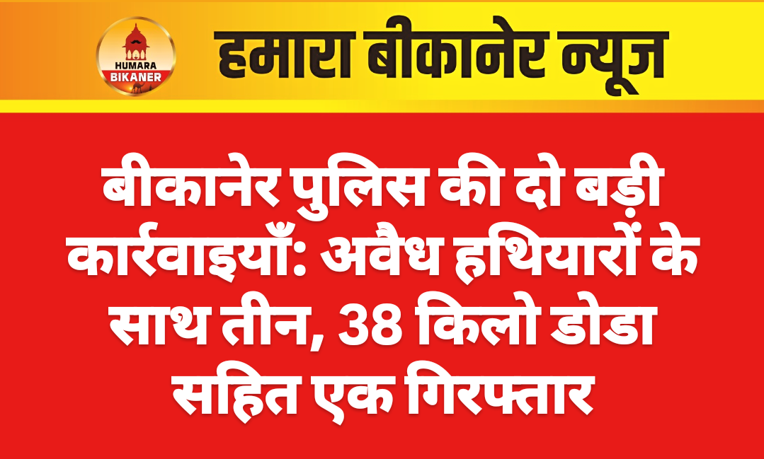 बीकानेर। बीकानेर पुलिस ने दो बड़ी कार्रवाई करते हुए अवैध डोडा और हथियारों के साथ चार को गिरफ्तार किया है। यह कार्रवाई आईजी हेमंत शर्मा के निर्देशों पर सूरतगढ़ व बीकानेर क्षेत्रों में की गयी है।बीकानेर के नोखा में एसपी कावेंद्र सागर के निर्देशों व थानाधिकारी नोखा अरविंद सिंह टीम ने कार्रवाई करते हुए अवैध हथियारों के खिलाफ कार्रवाई करते हुए तीन लोगों को गिरफ्तार किया है। पुलिस टीम ने सूचना के आधार पर कार्रवाई करते हए एक कैंपर गाड़ी आरजे 21 नंबर को रोका और पूछताछ की। संदिग्ध लगने पर कैंपर गाड़ी की तलाशी ली गयी। तलाशी के दौरान गाड़ी में सवार लोगों के पास अवैध पिस्टल मिली। पुलिस ने आरोपियों के पास दो पिस्टल व दो जिंदा कारतूसों के साथ तीन को गिरफ्ता र किया है। पुलिस ने छोटूसिंह, हरिराम और सोमदत को गिरफ्तार किया है।वहीं सूरतगढ़ शहर में पुलिस ने कार्रवाई करते हुए श्रवणसिंह और सुखदेव सिंह नाम के युवक के पास से 38 किलो अवैध डोडा जब्त किया है। पुलिस कार्रवाई के दौरान एक युवक सुखदेव मौका पाकर फरार हो गया। जबकि श्रवणसिंह को गिरफ्ता र किया है। जिनके पास से स्विफ्ट कार को जब्त किया है।