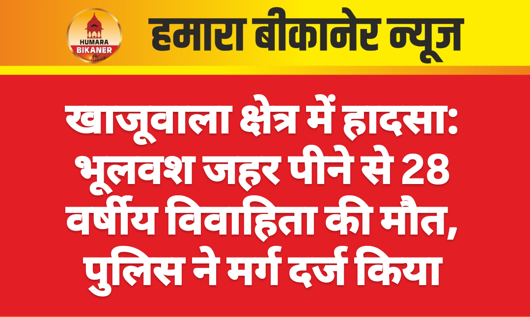 बीकानेर।भूलवश जहर पीने से विवाहिता की मौत हो जाने की खबर सामने आयी है। घटना खाजूवाला पुलिस थाना क्षेत्र के चक 13 केजेडी बी में 9 दिसंबर की है। इस सम्बंध में चक 13 केजेडी बी निवासी भूपराम पुत्र साहबराम ने रिपोर्ट दी है। परिवादी ने बताया कि उसकी 28 वर्षीय पत्नी कविता पत्नी भूपराम ने भूलवश जहर पी लिया। जिसके चलते उसकी मौत हो गयी। पुलिस ने प्रार्थी की रिपोर्ट के आधार पर मर्ग दर्ज कर जांच शुरू कर दी है।