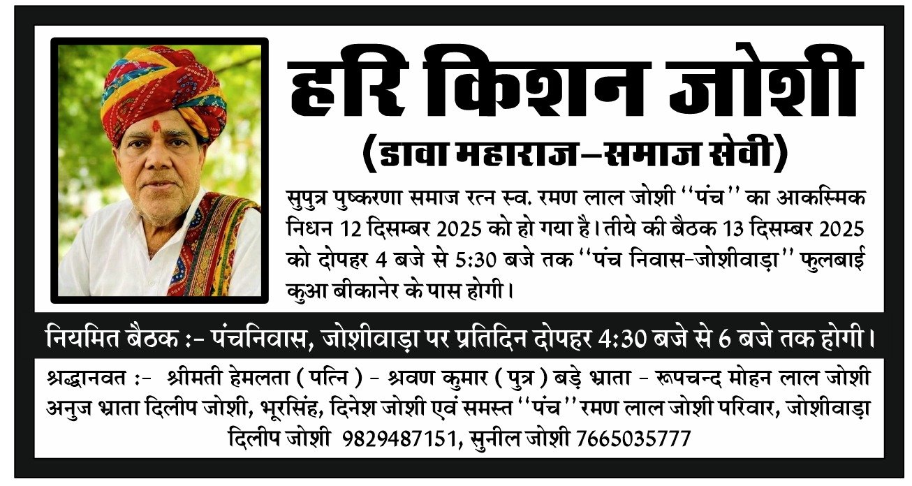जोशी लंबे समय से पुष्करणा समाज सहित 36 कौम में अपनी सेवा, सादगी और सामाजिक कार्यों के लिए व्यापक रूप से पहचाने जाते थे। समाज के विभिन्न क्षेत्रों से जुड़े प्रबुद्धजन उनके निवास पर पहुंचकर श्रद्धांजलि अर्पित कर रहे हैं।