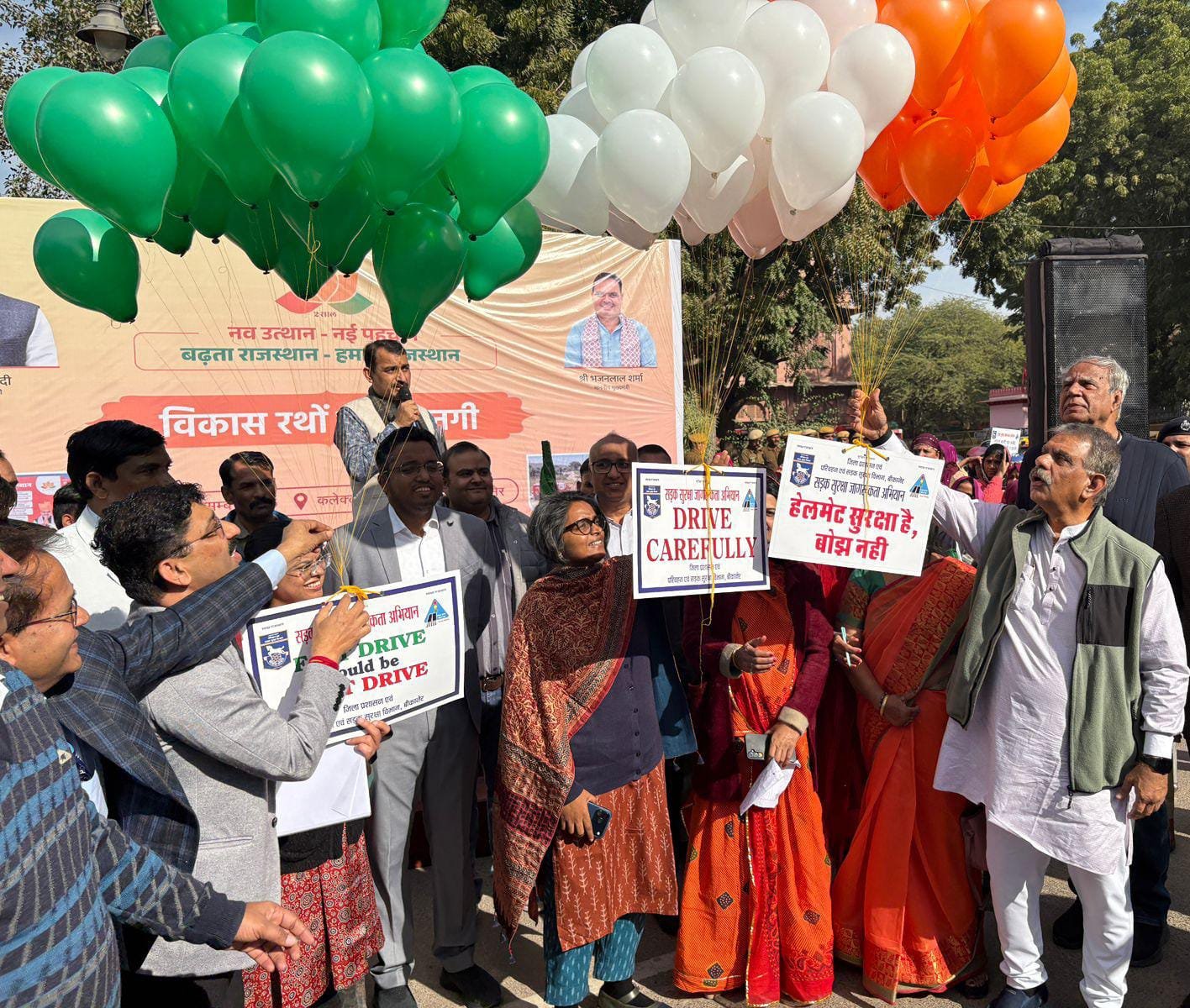 कार्यक्रम के अंतर्गत जनचेतना रैली को प्रभारी मंत्री श्री गजेन्द्र सिंह खींवसर, जिला कलेक्टर श्रीमती नम्रता वृष्णी, मयंक मनीष (आयुक्त, नगर निगम), अपर्णा गुप्ता (आयुक्त, बीकानेर विकास प्राधिकरण) एवं RTO अनिल पंड्या द्वारा हरी झंडी दिखाकर रवाना किया गया।