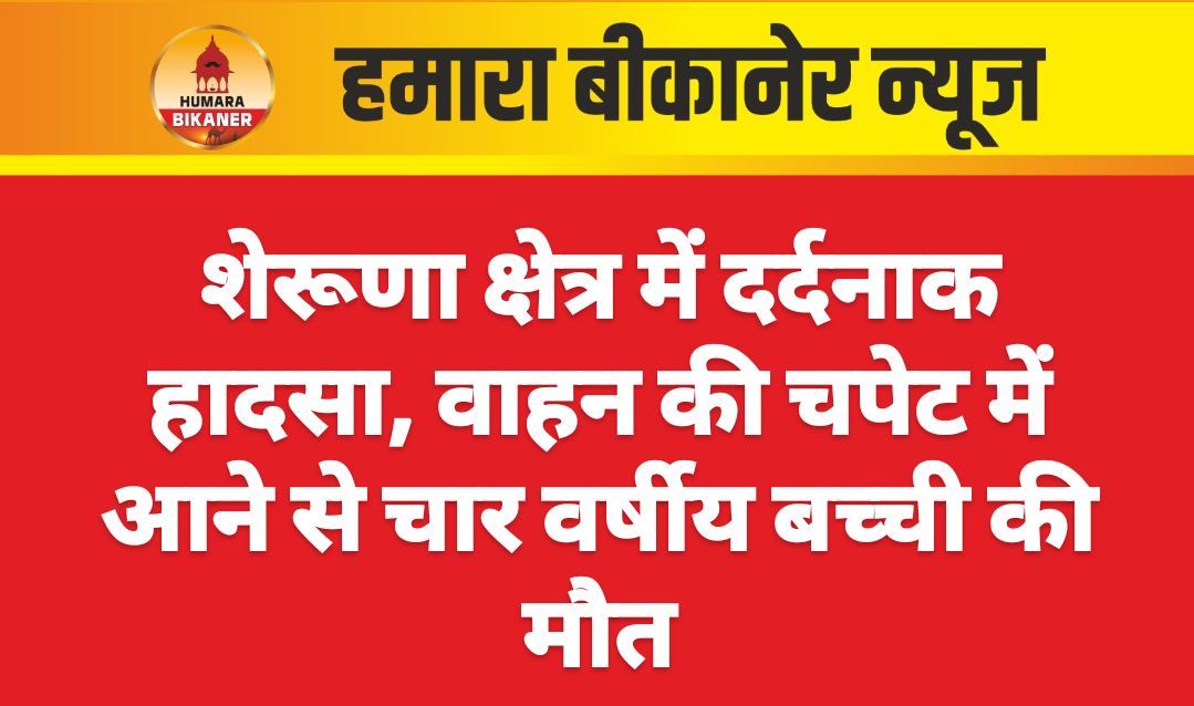 बीकानेर।खेलते समय वाहन की चपेट में आ जाने से चार वर्षीय बच्ची की मौत हो जाने की खबर सामने आयी है। घटना शेरूणा पुलिस थाना क्षेत्र के रोही देराजसर में 16 दिसंबर की है। इस सम्बंध में सरंगरसर निवासी लाभुराम ने रिपोर्ट दी है। परिवादी ने बताया कि उसकी बेटी खेलते समय वाहन की चपेट में आ गयी। जिसके चलते उसकी बेटी कोमल की मौत हो गयी। परिवादी चुरू का रहने वाला है और शेरूणा क्षेत्र में खेत काश्त करता है। पुलिस ने प्रार्थी की रिपोर्ट पर मर्ग दर्ज कर जांच शुरू कर दी है।