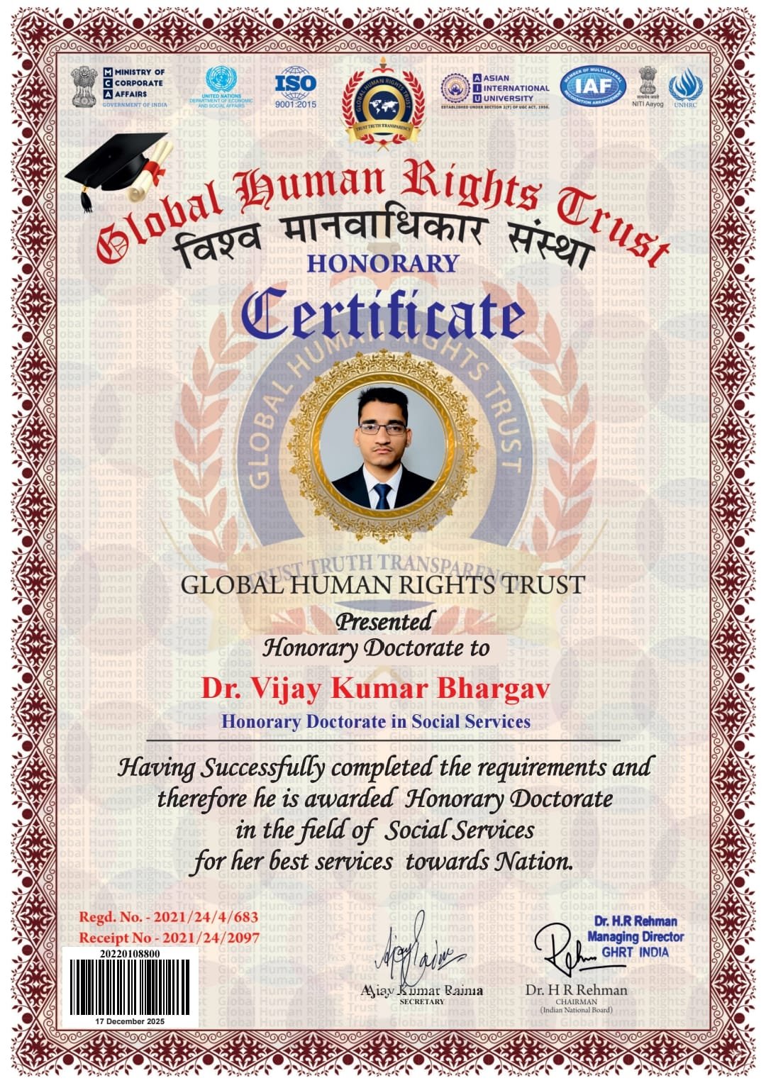 नोखा के वार्ड नं 35 निवासी विजय कुमार भार्गव को उनके द्वारा किए गए उल्लेखनीय कार्यों की बदौलत के अपने स्थानीय क्षेत्र में किए गए उत्कृष्ट कार्यों को देखते हुए ग्लोबल ह्यूमन राइट ट्रस्ट जम्मू के द्वारा ग्लोबल ह्यूमन राइट के चैयरमेन डॉ रहमान द्वारा डॉक्टरेट कि मानद उपाधि प्रदान कर नवाजा गया है। भार्गव को सम्मान मिलने के पर अनेक लोगों ने उन्हें बधाई व शुभकामनाएं दी हैं। भार्गव दोनों पैरों से दिव्यांग है जो गुल्लक में पैसे जुटाकर समाज सेवा करते हैं इन्होंने पहले सहयोग नारायण सेवा संस्था में दिया है और श्री कृष्ण गोपाल गौशाला नागौर और अपना घर आश्रम नोखा और स्थानीय क्षेत्र नोखा में वृक्षारोपण कार्यक्रम योगा कैंप निडी ब्रिज महिला अनाथ आश्रम सीकर में नाश्ता का सहयोग दिया है।