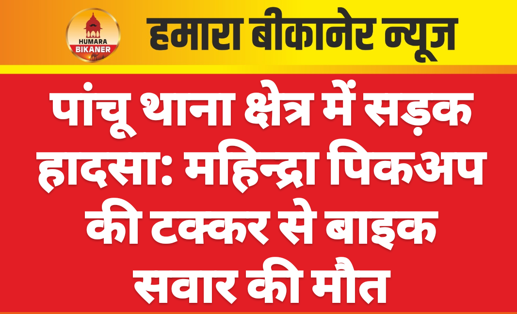 बीकानेर।महिन्द्रा पिकअप की टक्कर से बाइक सवार की मौत हो जाने की खबर सामने आयी है। घटना पांचू पुलिस थाना क्षेत्र के किशनासर के पास 18 दिसंबर की दोपहर को 2 बजे के आसपास की है। इस सम्बंध में बंधाला निवासी रामकिशन पुत्र भोलाराम ने महिन्द्रा पिकअप के चालक के खिलाफ मुकदमा दर्ज करवाया है।