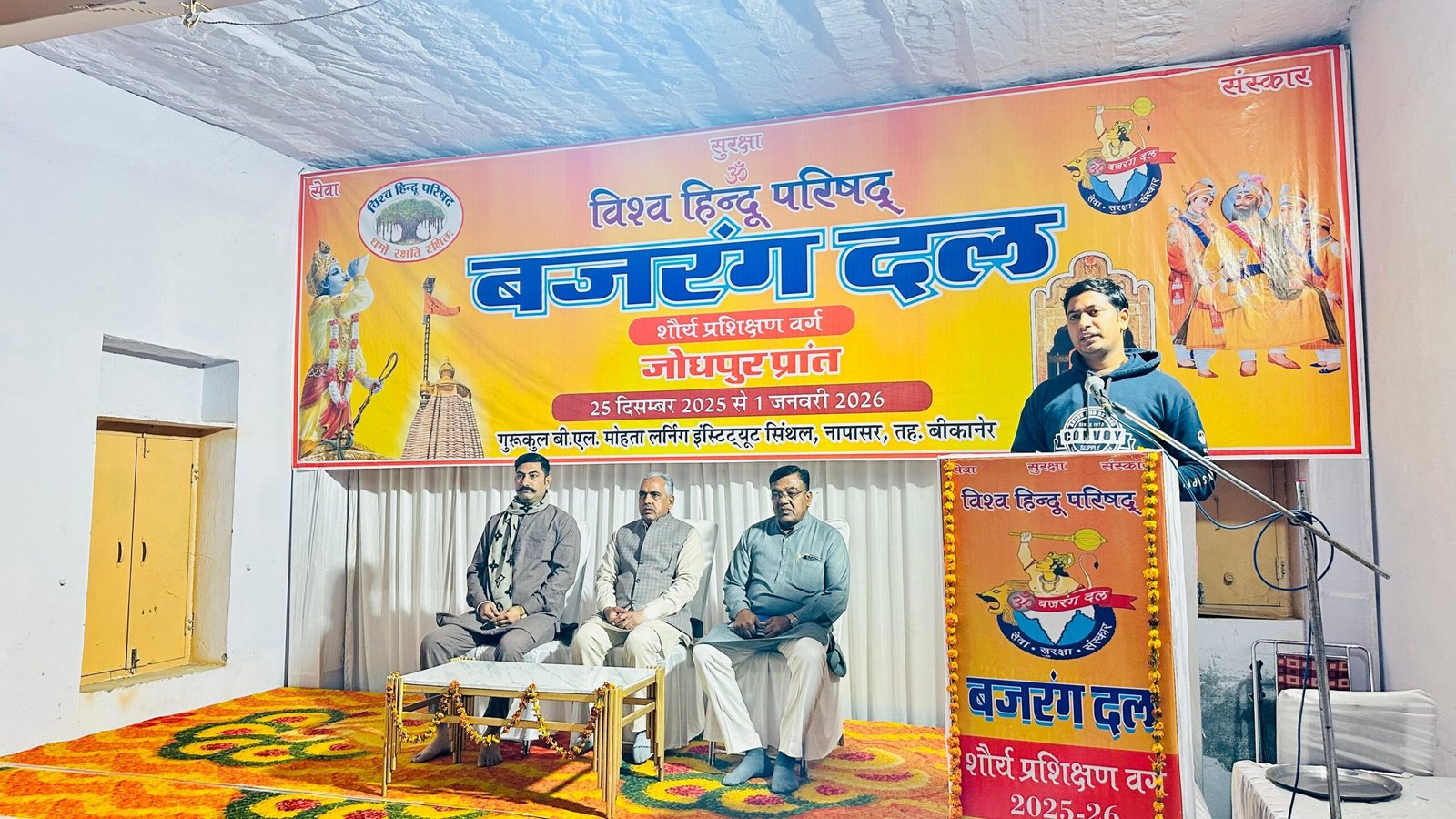 कार्यक्रम में वर्ग पालक भूपेश ,बी एल मेहता इंस्टीट्यूट के संचालक बाबूलाल , बजरंग दल प्रान्त संयोजक विक्रम परिहार ,सह संयोजक दीपक प्रजापत ,बौद्धिक प्रमुख खरताराम , सह बौद्धिक प्रमुख दिनेश परिहार ,प्रांत गौ रक्षा प्रमुख इंद्रजीत , प्रांत प्रशिक्षण प्रमुख सचिन ,मुख्य शिक्षक उमेश ,प्रांत मिलन प्रमुख गजेंद्र ,विभाग मंत्री विनोद सेन जिला मंत्री राजेन्द्र सहित बजरंग दल के अनेक कार्यकर्ता उपस्थित थे