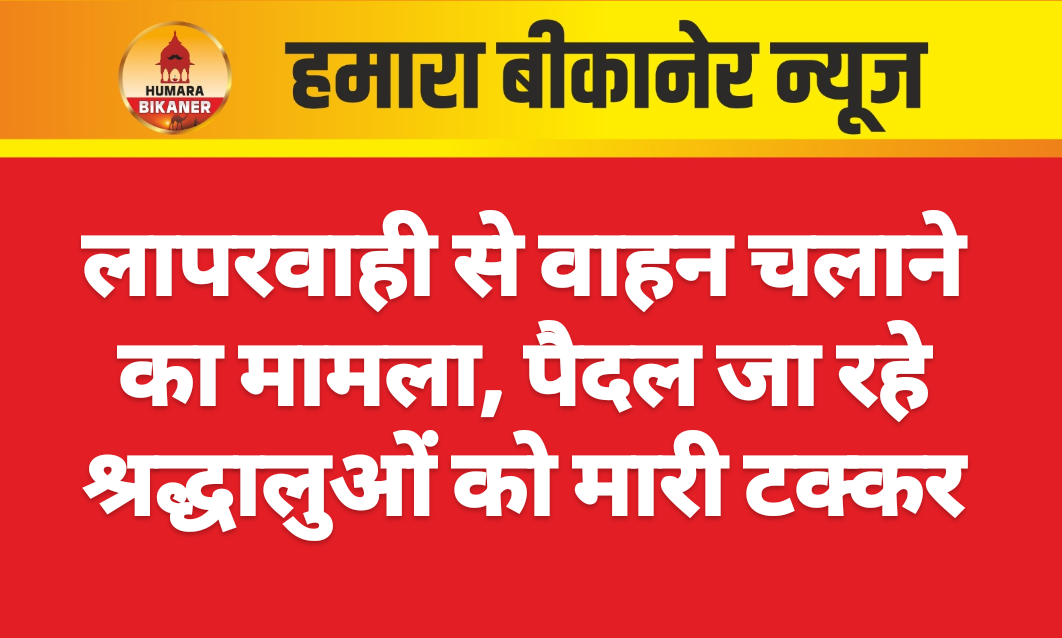 बीकानेर।लापरवाही से गाड़ी चलाते हुए पैदल भगवान के जा रहे भक्तों को टक्कर मार देने की खबर सामने आयी है। घटना नापासर पुलिस थाना क्षेत्र के नापासर-बीकानेर रोड़ पर 30 दिसंबर की सुबह करीब साढ़े छह बजे के आसपास की है। इस सम्बंध में मंयक व्यास पुत्र श्यामसुंदर व्यास ने गाड़ी चालक के खिलाफ मुकदमा दर्ज करवाया है।प्रार्थी ने बताया कि हम करीब 10-12 लोग पैदल भगवान के जा रहे थे। इस दौरान गाड़ी चालक ने लापरवाही से गाड़ी चलाते हुए पीछे से टक्कर मार दी। जिससे उसकी बहन और उसका दोस्त गिर गए और घायल हो गए। पुलिस ने प्रार्थी की रिपोर्ट के आधार पर मुकदमा दर्ज कर जांच शुरू कर दी है।