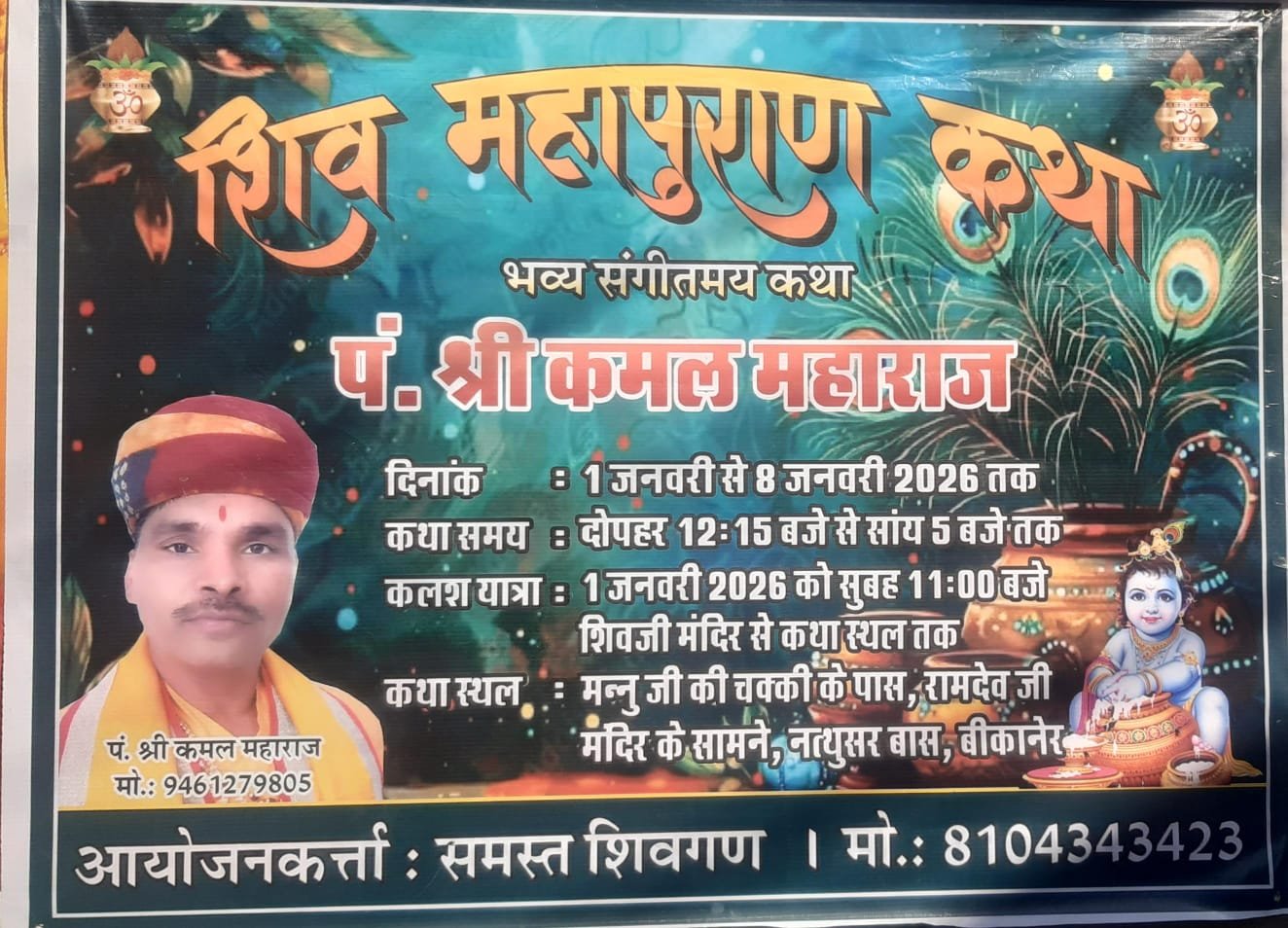 बीकानेर।नववर्ष के पावन अवसर पर शिवभक्ति और आध्यात्मिक चेतना को जागृत करने हेतु शिव महापुराण कथा का भव्य आयोजन किया जा रहा है। यह भव्य एवं संगीतमय शिव महापुराण कथा सुप्रसिद्ध कथावाचक पं. श्री कमल महाराज के श्रीमुख से संपन्न होगी। यह आयोजन 1 जनवरी 2026 से 8 जनवरी 2026 तक प्रतिदिन आयोजित किया जाएगा, जिसमें कथा का समय दोपहर 12:15 बजे से सायं 5 बजे तक निर्धारित किया गया है। कथा के शुभारंभ अवसर पर 1 जनवरी 2026, गुरुवार को प्रातः 11 बजे भव्य कलश यात्रा निकाली जाएगी, जो शिवजी मंदिर से प्रारंभ होकर कथा स्थल तक पहुंचेगी। कलश यात्रा में बड़ी संख्या में श्रद्धालुजन पारंपरिक वेशभूषा के साथ सहभागिता करेंगे।