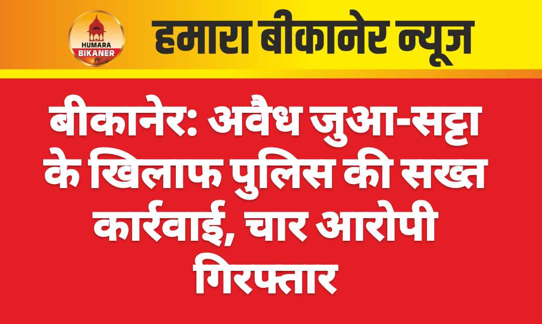 बीकानेर। स्थानीय पुलिस ने अवैध जुआ और सट्टा खेलने वालों के खिलाफ सख्त रुख अपनाते हुए दो अलग-अलग स्थानों पर कार्रवाई की। इसमें चार आरोपियों को रंगे हाथों गिरफ्तार कर उनके पास से नकदी और सट्टा पर्चियां बरामद की हैं। पहली कार्रवाई बीदासर रोड स्थित बीएसएनएल टावर के पास की गई। एसआई रतनलाल के नेतृत्व में पुलिस टीम ने मुखबिर की सूचना पर वहां दबिश दी। वहां पर ताश के पत्तों पर जुआ खेल रहे तीन युवकों को दबोचा गया। पकड़े गए आरोपियों की पहचान राजकुमार मोदी, साबीर सब्जीफरोश और कैलाश सिकलीगर के रूप में हुई है। मौके से ताश की गड्डी और 3240 रुपए नकद जब्त किए। वहीं दूसरी कार्रवाई घूमचक्कर सर्किल के पास की गई। हेड कांस्टेबल भगवानाराम ने गश्त के दौरान सट्टे की खाईवाली करते हुए सत्यनारायण राजपुर को गिरफ्तार किया। आरोपी के कब्जे से सट्टा पर्चियां और 360 रुपए बरामद किए।