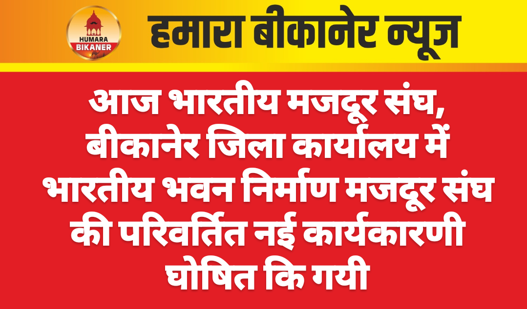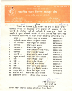 भारतीय भवन निर्माण मज़दूर संघ (सम्बन्ध भारतीय मज़दूर संघ) की जिला इकाई की नई कार्यकारिणी का गठन आज औपचारिक रूप से घोषित किया गया।जिलाध्यक्ष श्री अनुप प्रजापत की अध्यक्षता एवं प्रदेश महामंत्री श्री हरिशंकर शर्मा की उपस्थिति में सम्पन्न हुआ| सम्मेलन में संगठनात्मक जरूरतों एवं आगामी सत्र के कार्यक्रमों को ध्यान में रखते हुए कार्यकारिणी में बदलाव करने का निर्णय लिया गया था। चुनाव प्रक्रिया प्रदेश उपाध्यक्ष एवं चुनाव अधिकारी श्री गौरीशंकर व्यास के निर्देशन में सर्वसम्मति से सम्पन्न हुई।