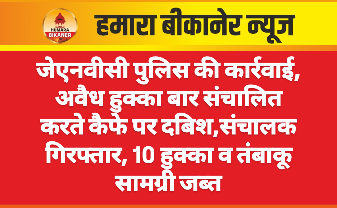 बीकानेर।पुलिस टीम ने कैफे पर दबिश देकर मौके से सामान जब्त किया है। यह कार्रवाई जेएनवीसी पुलिस टीम ने सेक्टर नंबर तीन में गुरूद्धारा रोड़ पर संचालित कैफे पर की है। पुलिस टीम ने कूल क्राउड केफे पर दबिश दी है। जहां पर अवैध रूप से हुक्का बार संचालित हो रहा था। पुलिस टीम ने मौके से 10 हुक्का, 14 तंबाकू फ्लेवर, 3 डिब्बे अलग-अलग फ्लेवर के, 10 हुक्के पाइप सहित सामान जब्त किया है। पुलिस ने संचालक वंस शर्मा को गिरफ्तार किया है। कार्रवाई करने वाली टीम में रोहित चोधरी के साथ कांस्टेबल हरफूल सिंह यादव, राजाराम भी शामिल रहें।