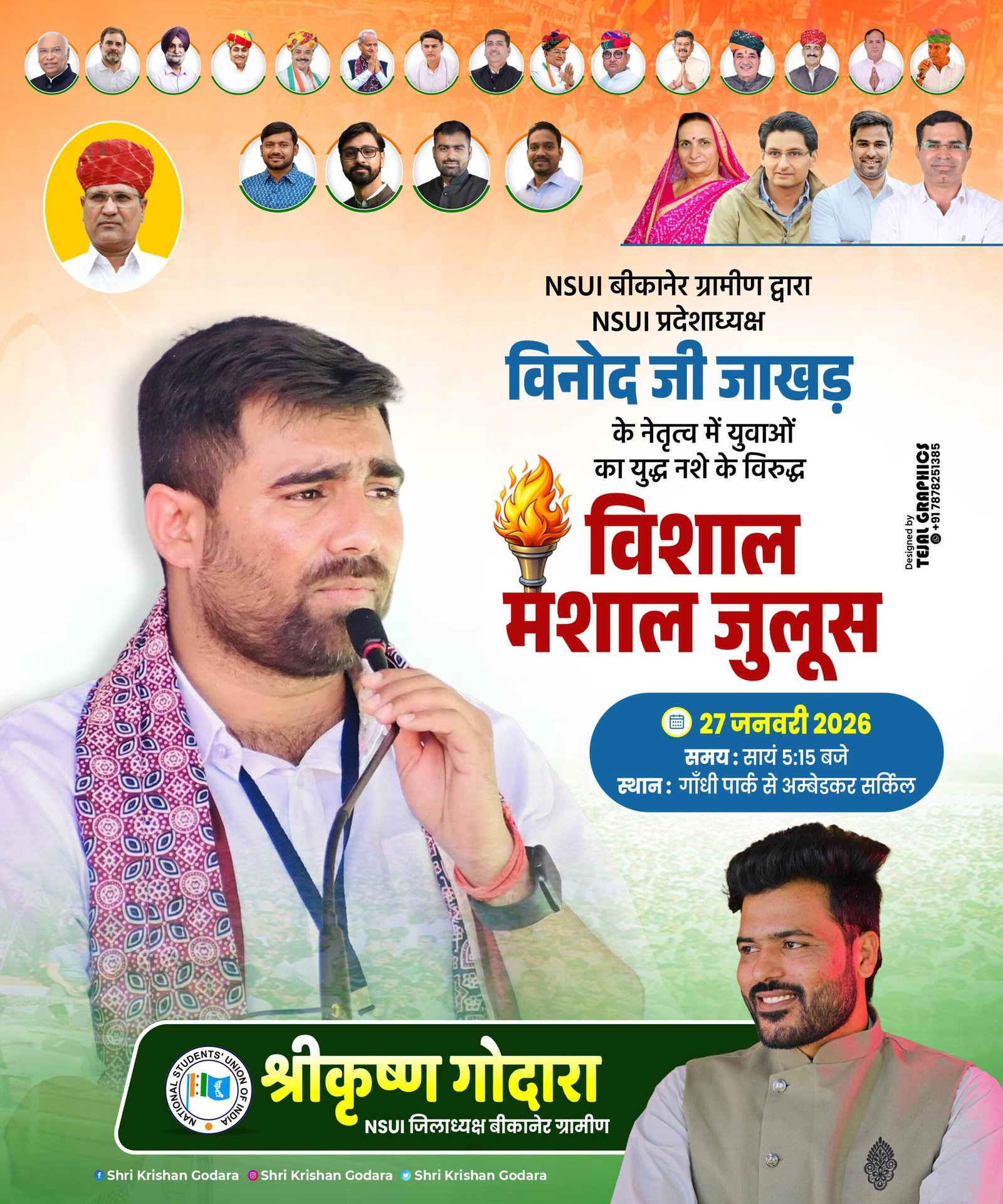 NSUI ने बीकानेर ग्रामीण के सभी युवाओं से अपील की है कि वे अधिक से अधिक संख्या में इस मशाल जुलूस में शामिल होकर नशे के खिलाफ एकजुट होकर आवाज बुलंद करें और नशामुक्त, स्वस्थ एवं सकारात्मक समाज के निर्माण में अपनी सहभागिता निभाएं।