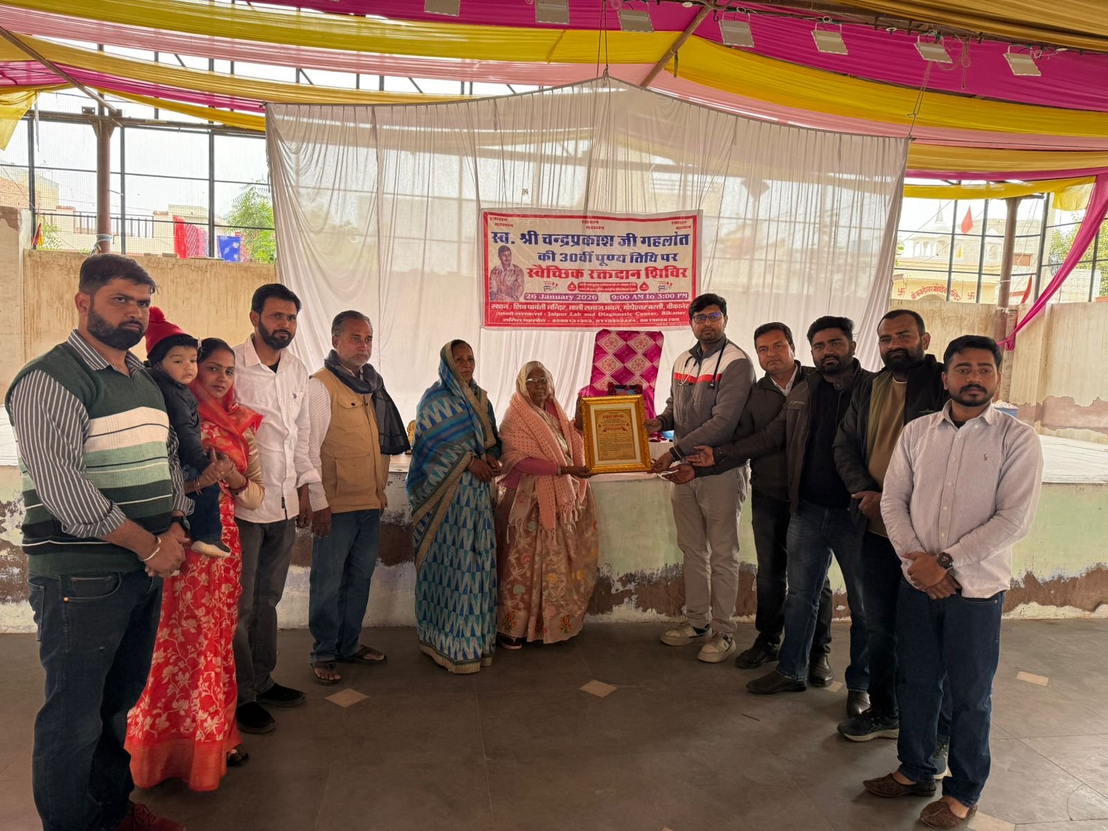 जयपुर लेब & डायग्नोस्टिक, माली समाज भवन गोपेश्वर बस्ती26 जनवरी 2026: चंद्र प्रकाश जी गहलोत की 30वीं पुण्यतिथि के अवसर पर एक भव्य रक्तदान शिविर का आयोजन किया गया। इस शिविर में समाज के महानुभावों डॉ. कन्हैयालाल कछावा, यशपाल गहलोत, बाबूलाल जी गहलोत, मुकेश पंवार तथा चंद्रप्रकाश गहलोत ने विशेष रूप से भाग लिया।